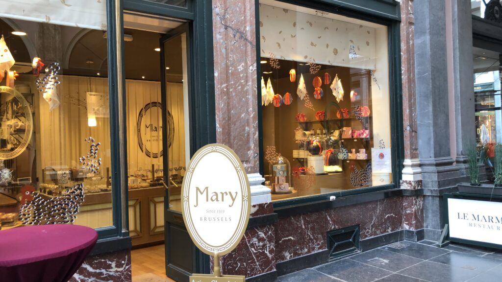Mary Chocolatier — Galerie de la Reine 36, 1000 Bruxelles. Muy clásica, cajas bonitas y un punto “joyería” en el escaparate; en la propia ficha indican el origen de la maison en 1919.