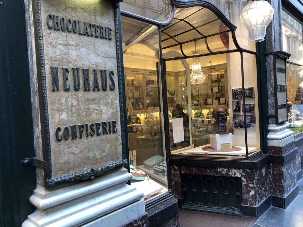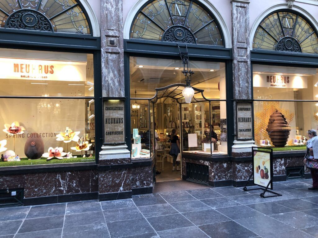 Neuhaus (tienda histórica) — Galerie de la Reine 25–27, 1000 Bruxelles. Es la marca asociada a la invención/auge de la “praliné” belga y aquí lo venden como “la primera tienda” de la casa en Bruselas. Originalmente, era una farmacia y de ahí su imagen farmacéutica. Comercializaban una pastilla para la tos muy amarga, y para poder venderla mejor la recubrían de chocolate. Los niños fingían que estaban malos para poder degustar el chocolate. Con el tiempo, se volvió más popular por el dulce, hasta que se dedicó completamente al negocio. Normalmente hay tres tipos de bombones: los praslines, garnash (suaves) y las trufas. Una buena caja tiene de los tres tipos.