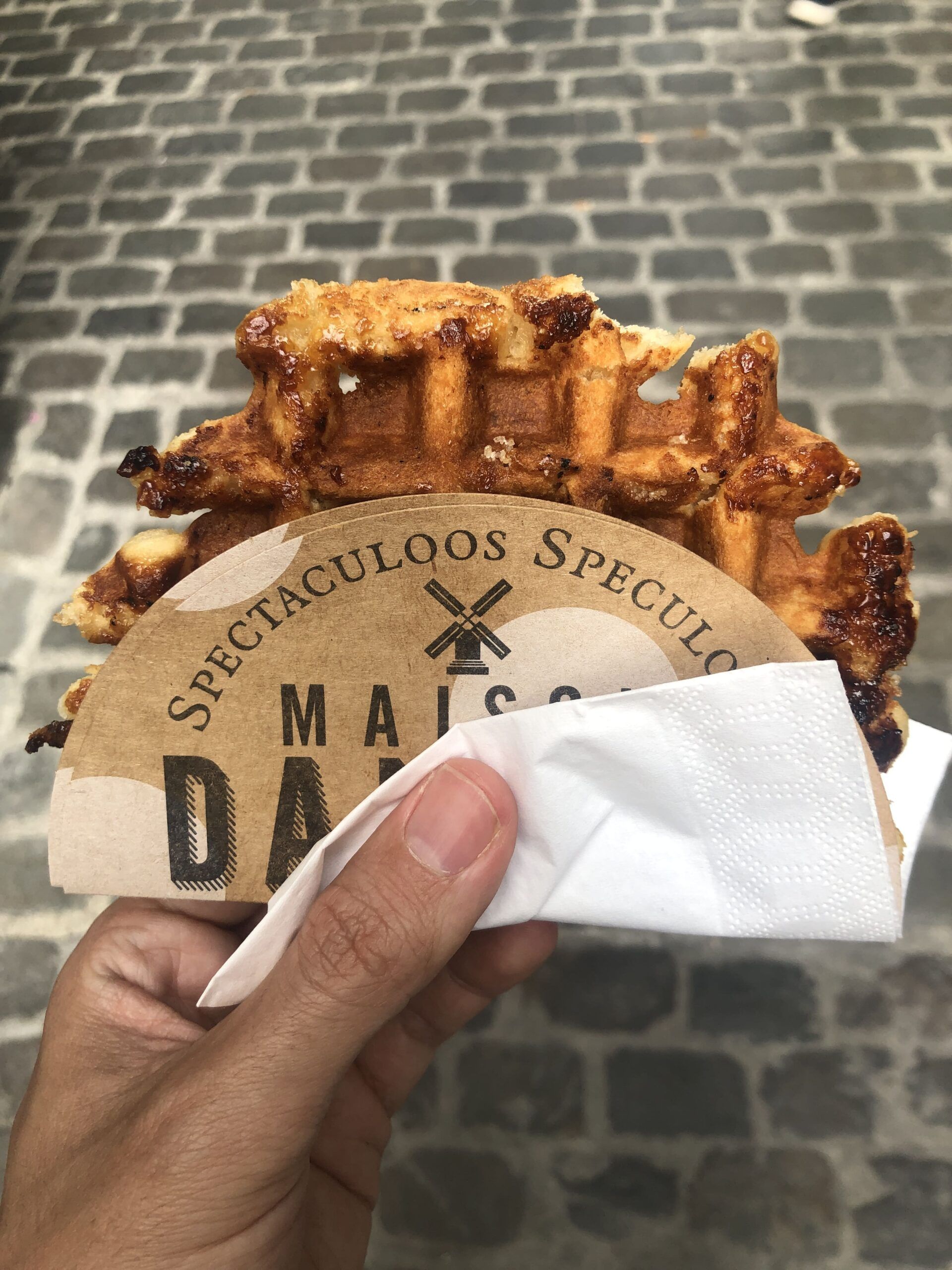 Degustando un fantástico gofre de Lieja de Maison Dandoy