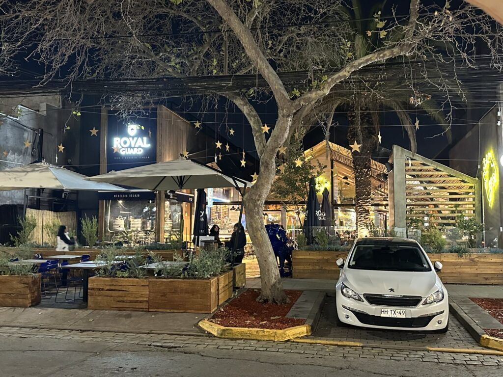 Cuando cae la noche, Barrio Italia se ilumina con luces cálidas y música suave. Los restaurantes ofrecen una sorprendente variedad: desde cocina chilena reinterpretada hasta italiana, japonesa o mediterránea.
