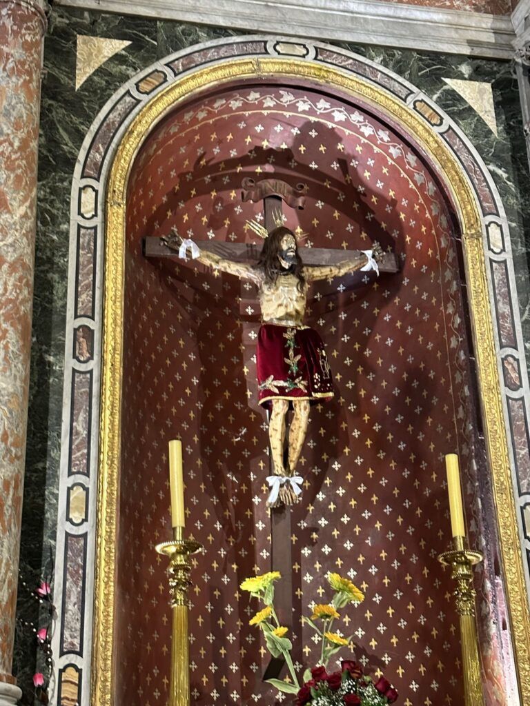 El gran tesoro del templo es el Cristo de los Milagros, también conocido como el Cristo de Mayo o el Cristo que suda sangre.