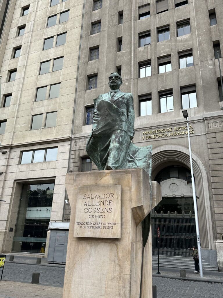 Después de caminar unos 20 minutos desde nuestro hotel, llegamos y comenzamos la jornada en la Plaza de la Constitución, rodeada por esculturas y jardines cuidados, frente al imponente Palacio de La Moneda, sede del gobierno chileno.