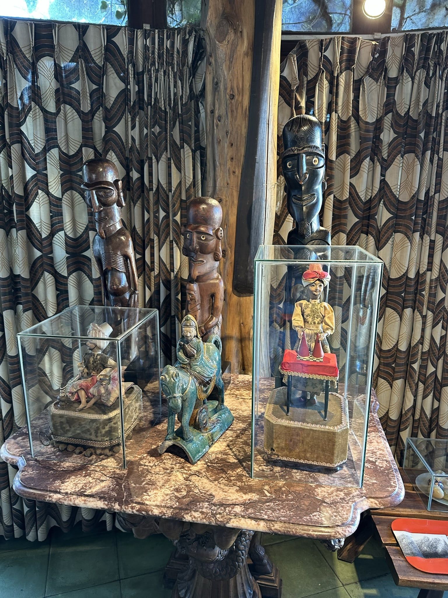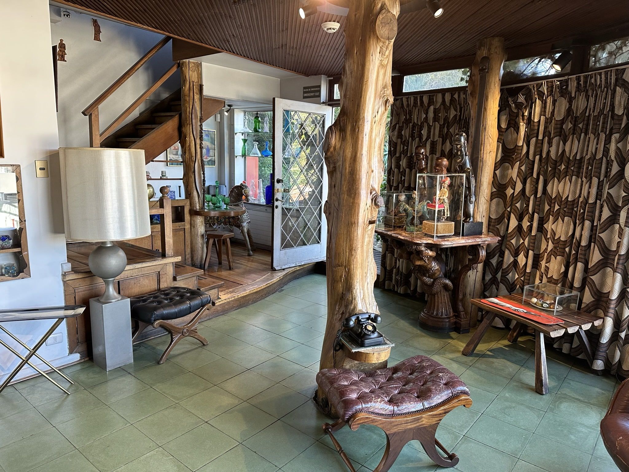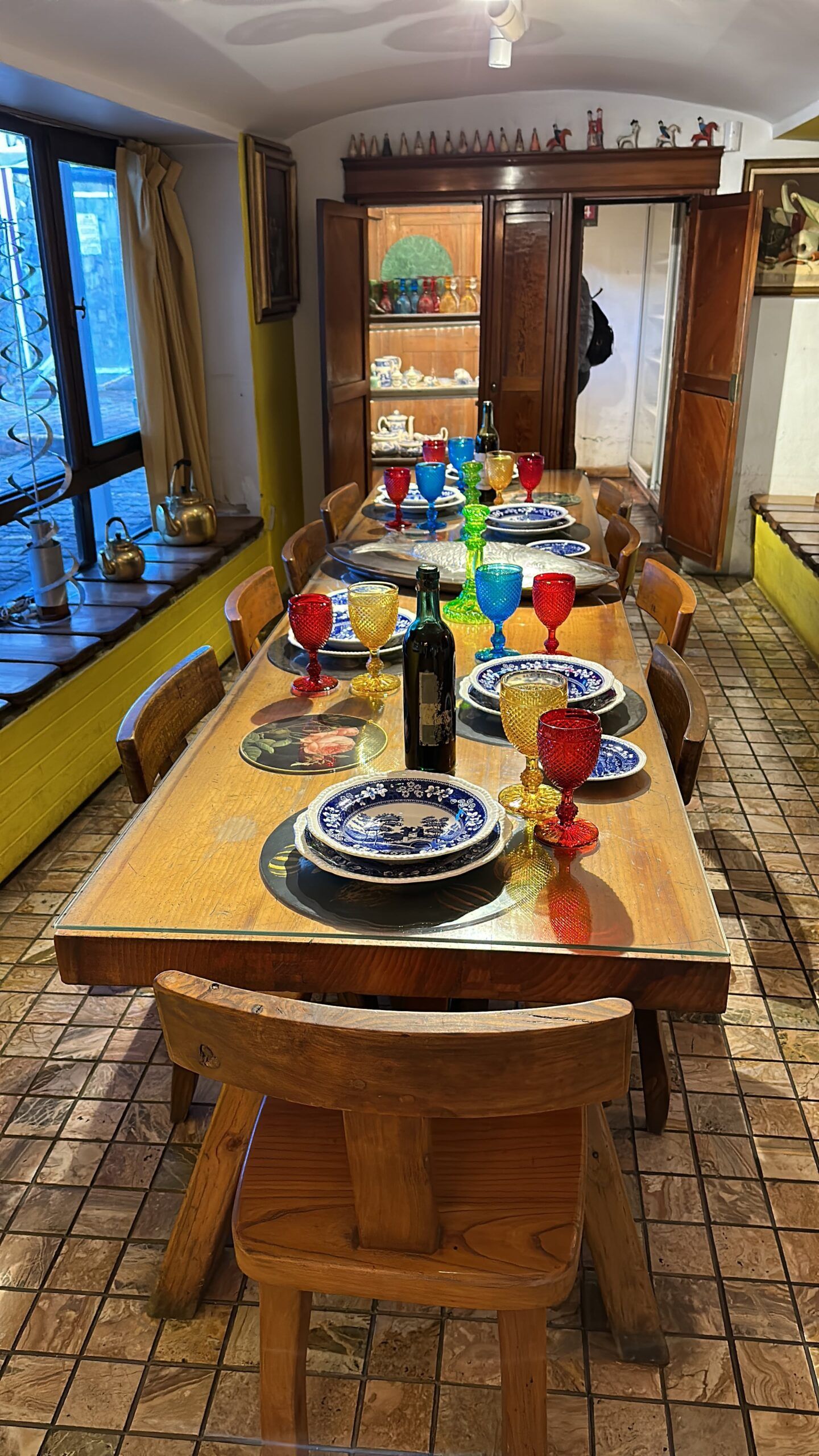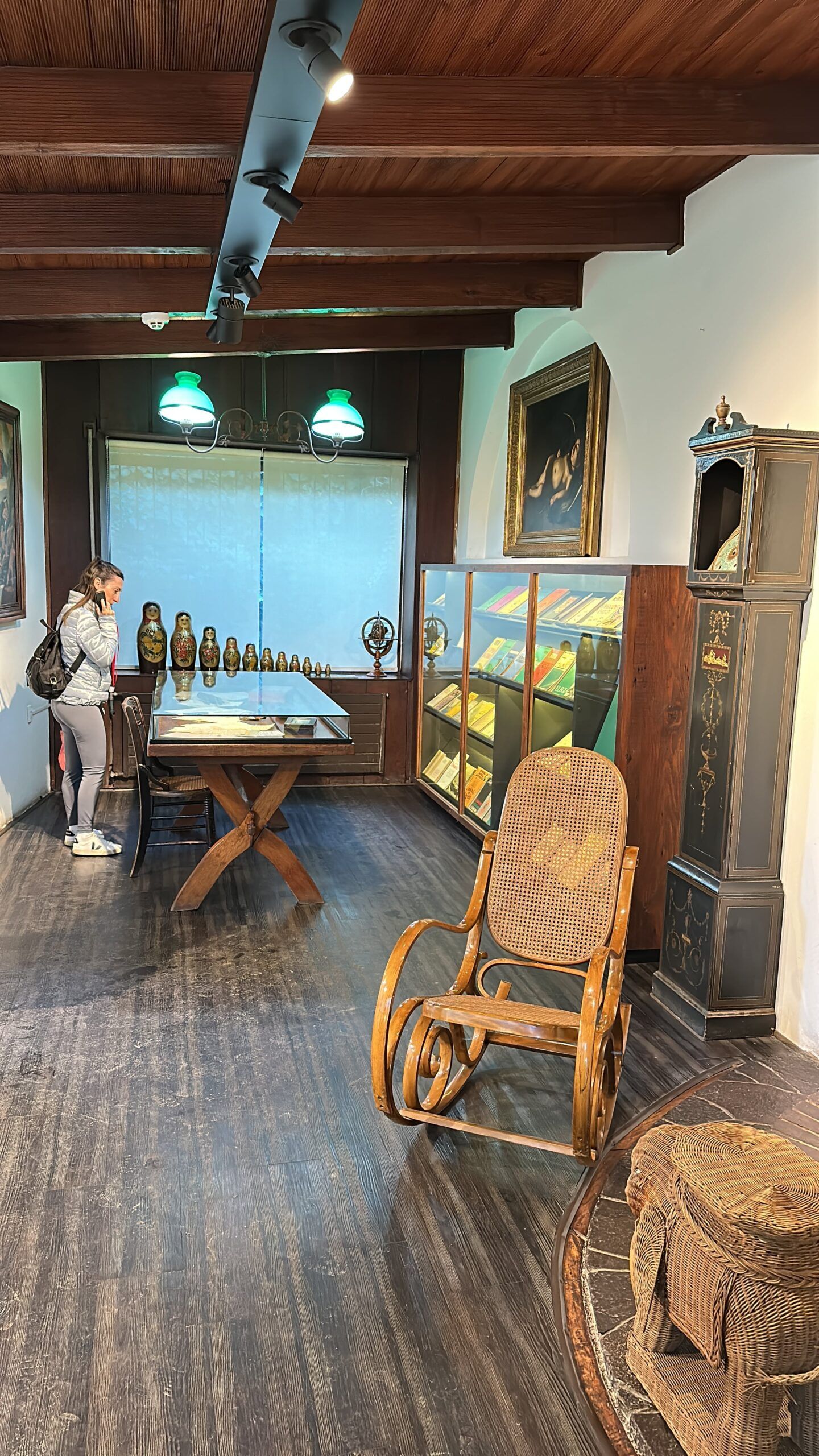 Desde afuera parece una casa pequeña, casi humilde, pero al recorrerla uno descubre una sucesión de estancias íntimas: el salón azul lleno de objetos marinos, el comedor con lámparas de cobre y cristales de colores, la biblioteca y la habitación principal, donde aún se respira la complicidad que hubo en su día entre Neruda y Matilde. Todo está dispuesto con ese orden caótico tan característico del poeta: mascarones de proa, botellas de vidrio, mapas, fotografías y recuerdos de sus viajes.