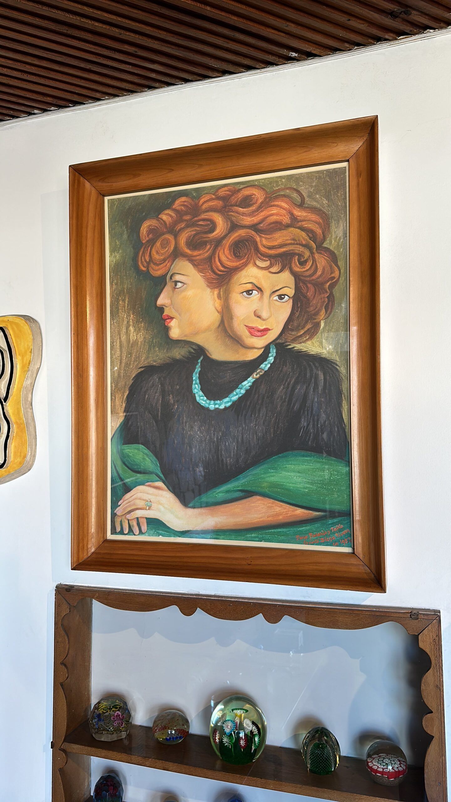 En la sala de estar podemos destacar una pintura de Diego Rivera que muestra a Matilde con dos rostros: uno visible y otro oculto entre su melena, representando el amor clandestino. También podemos observar unas copas mejicanas y un caballito indio.