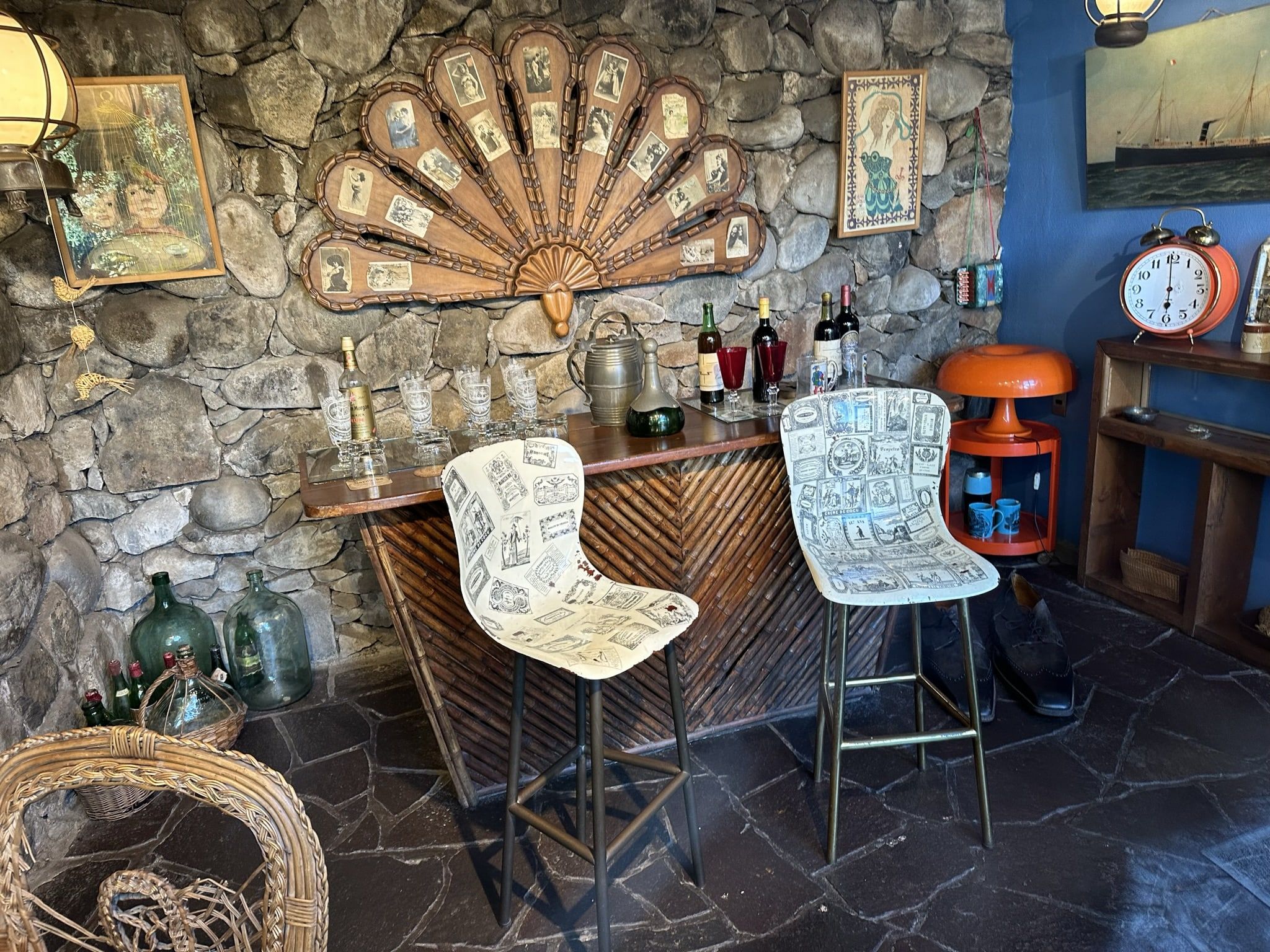 Una del las primeras estancias es la sala del bar del capitán. Hay brújulas, catalejos y maquetas navales que reflejan la obsesión del poeta por el mar y los barcos, y nos invita a sentirnos a bordo de una nave, a pesar de vivir en medio de los Andes. En la imagen destaca el coleccionismo exquisito del poeta a través de una vajilla mejicana, otra inglesa o copas portuguesas. Justo al final del bar se encuentra un pasaje secreto por el que aparecía y desaparecía.