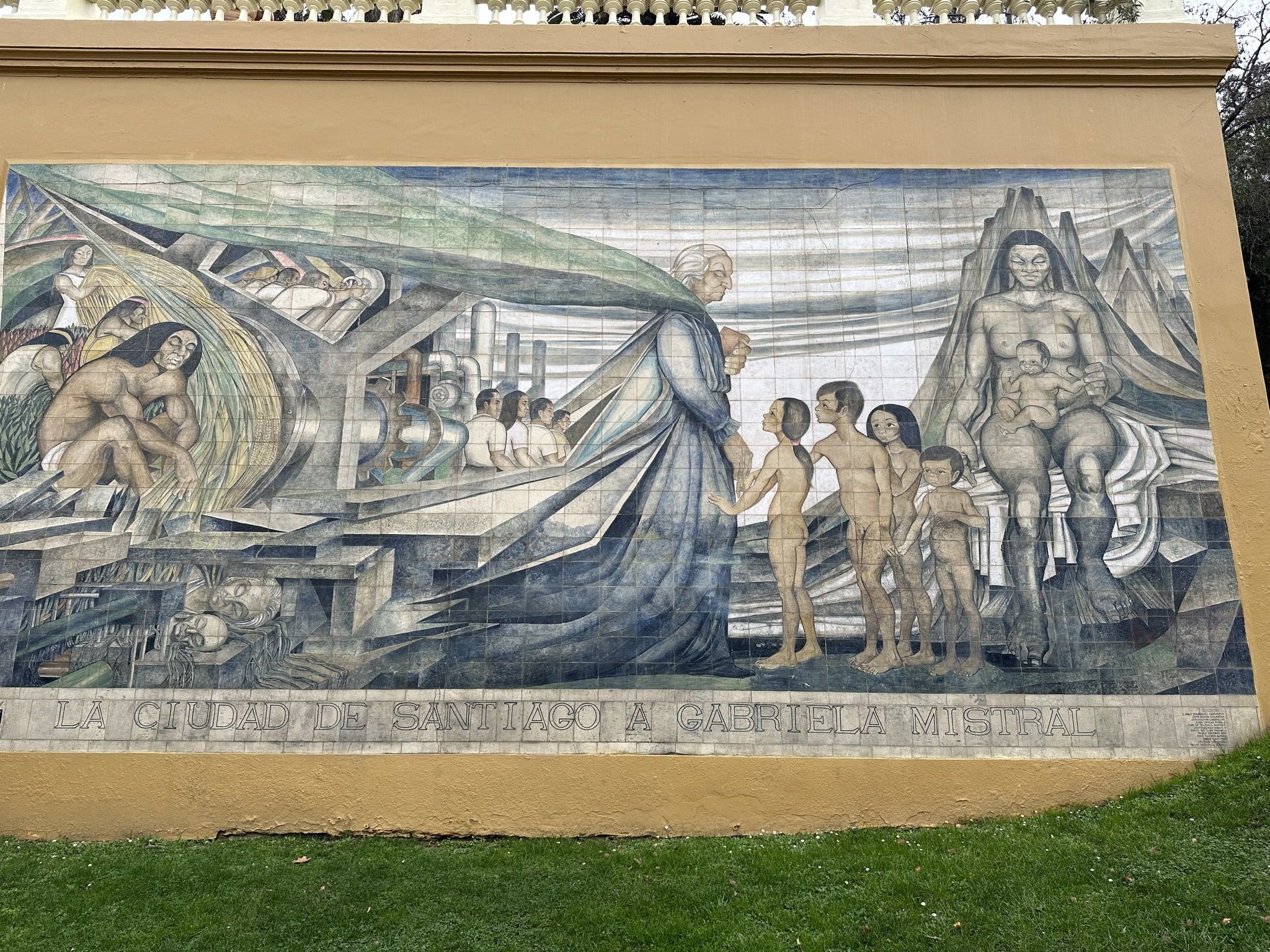La entrada al Cerro de Santa Lucía con la bandera de ChileEn el parque nos encontramos un precioso mural dedicado a Gabriela Mistral, premio nobel de literatura de 1945, en el que se muestra como una figura maternal y protectora, tendiendo la mano a un grupo de niños desnudos que simbolizan la infancia, la educación y el futuro de América Latina