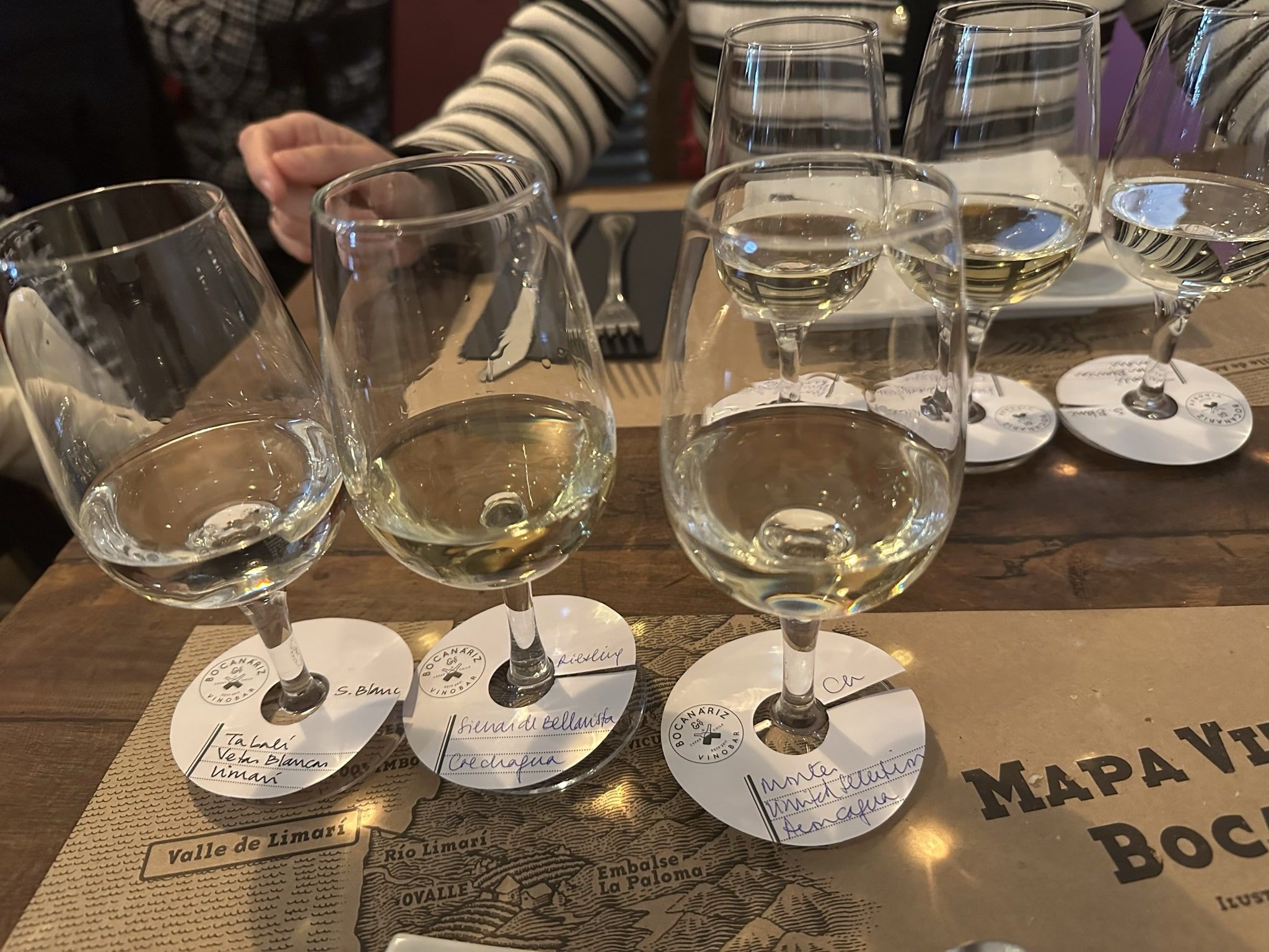 Comenzamos con una degustación de vinos blancos: 1️⃣ Sauvignon Blanc Tabalí Vetas Blancas, fresco y mineral. 2️⃣ Riesling Sierra de Bellavista, con notas florales y cítricas. 3️⃣ Chardonnay Montes Limited Selection, del Valle del Aconcagua, untuoso y elegante.