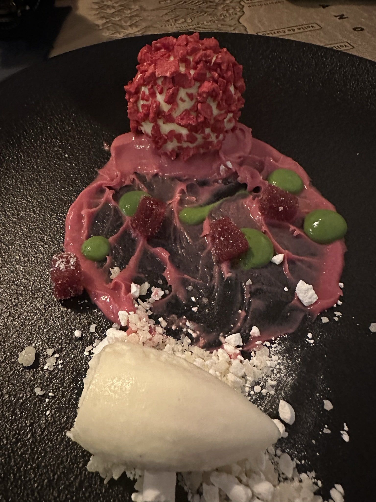 El postre fue una auténtica obra de arte: esfera de chocolate blanco con frambuesa y helado de queso de cabra con peta zetas, una explosión de texturas y sorpresa. Todo acompañado de un servicio impecable y el ambiente relajado de una tarde santiaguina entre risas, vino y conversación.