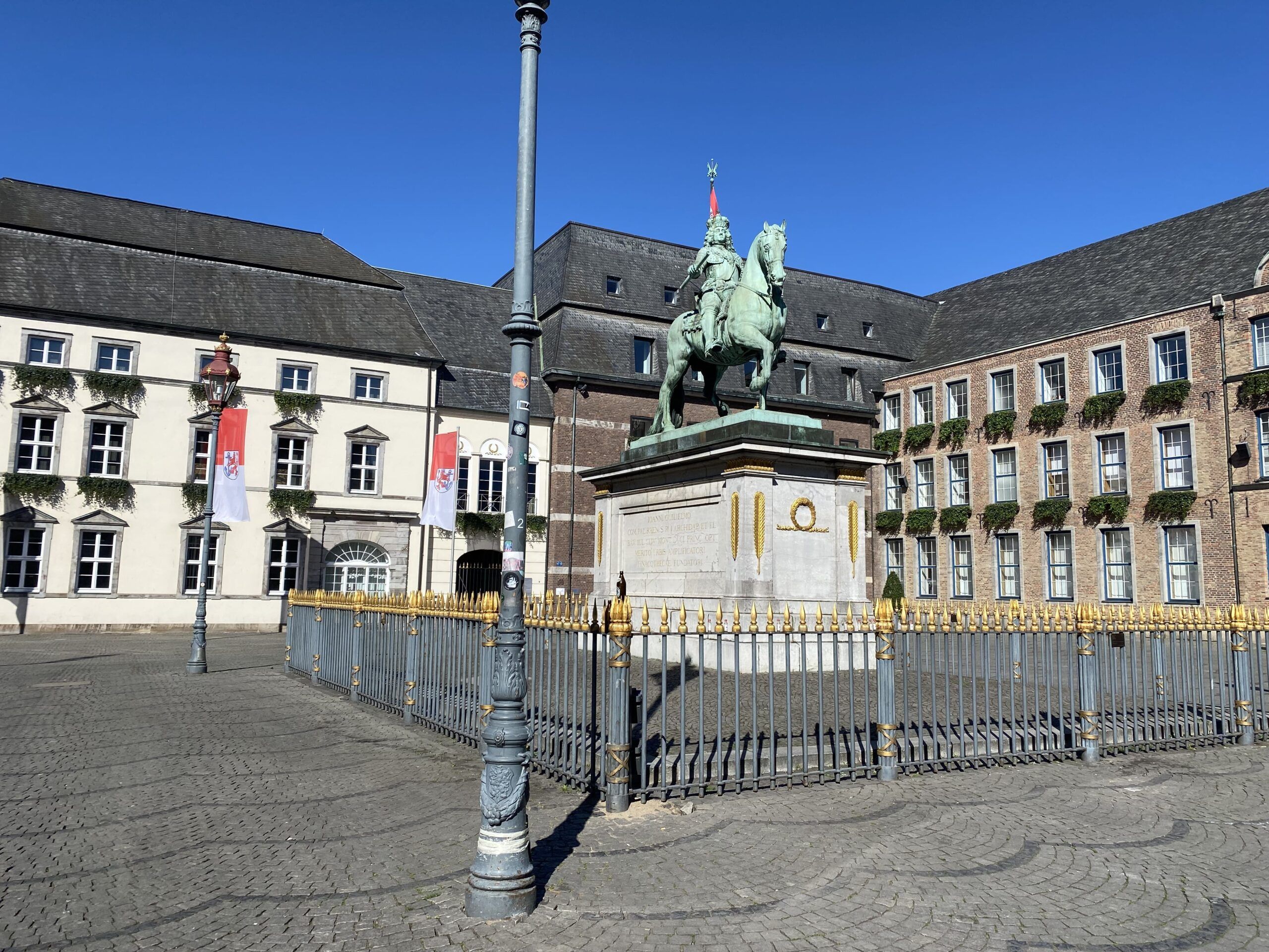 En medio de la plaza nos espera uno de los personajes más conocidos de la ciudad: Jan Wellem (Johann Wilhelm). Su estatua ecuestre, levantada a comienzos del siglo XVIII, es casi un fotograma fijo del Düsseldorf cortesano: el gobernante que se recuerda por su peso político y por el impulso cultural que dejó en la ciudad.