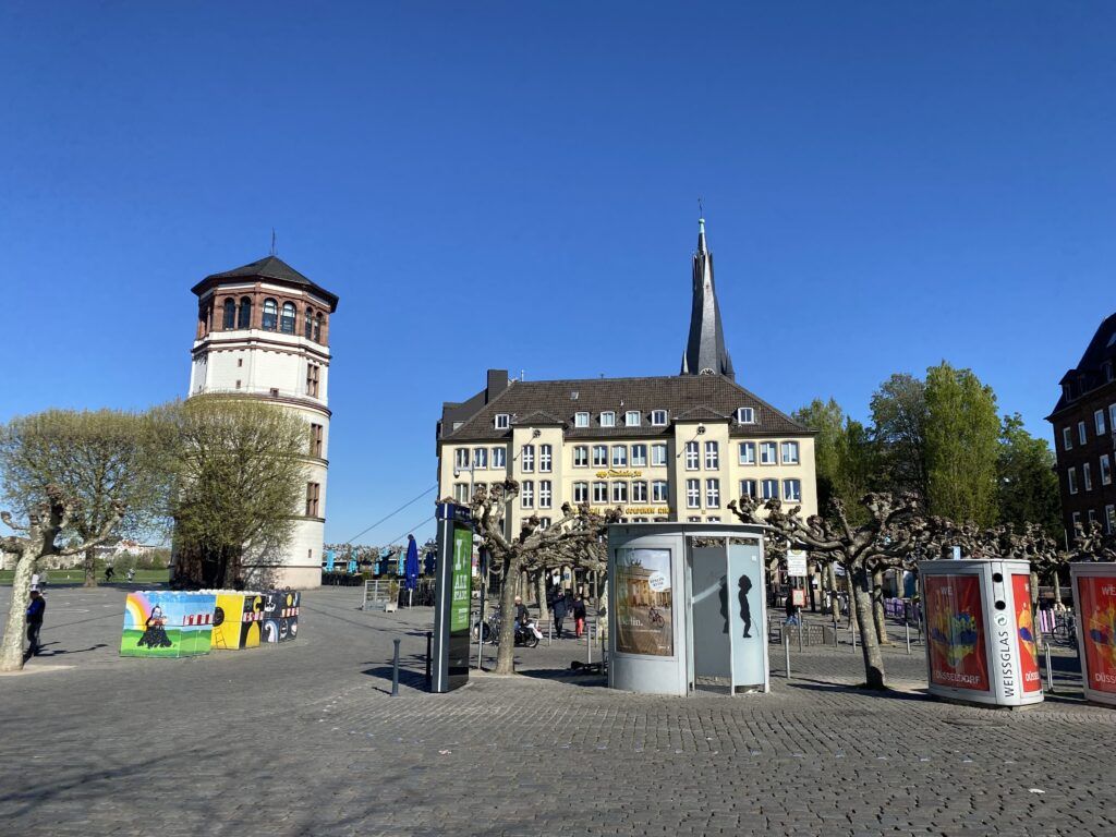 Desde Marktplatz, se baja hacia Burgplatz, que es donde la ciudad te enseña su otra cara: la de sede residencial. Aquí estaba el castillo de Düsseldorf y, aunque el conjunto desapareció, queda la pieza que lo explica: la Schlossturm.