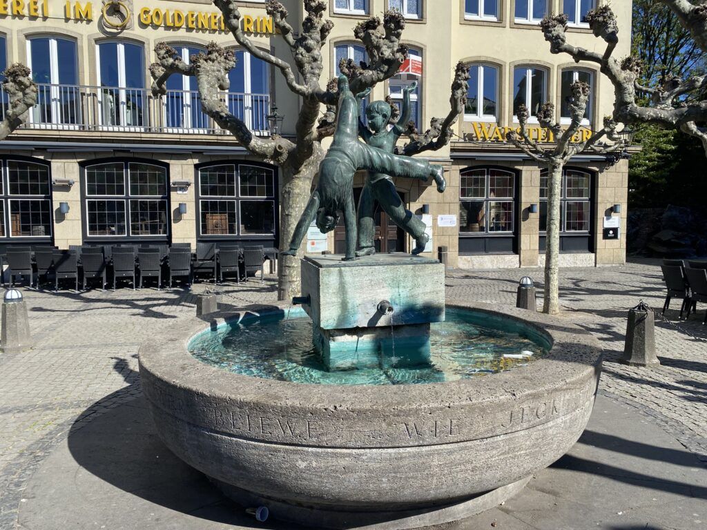 El Radschlägerbrunnen (que significa la “fuente de los niños que dan volteretas”) está en Burgplatz. La fuente muestra a dos niños de bronce en distintas fases del radschlagen (dar la voltereta lateral), una tradición local con siglos de historias y mitos alrededor. Se inauguró en 1954 y la realizó el escultor Alfred Zschorsch, por encargo y donación de la asociación Düsseldorfer Jonges, que quería una escena coral y popular, no una figura heroica aislada.