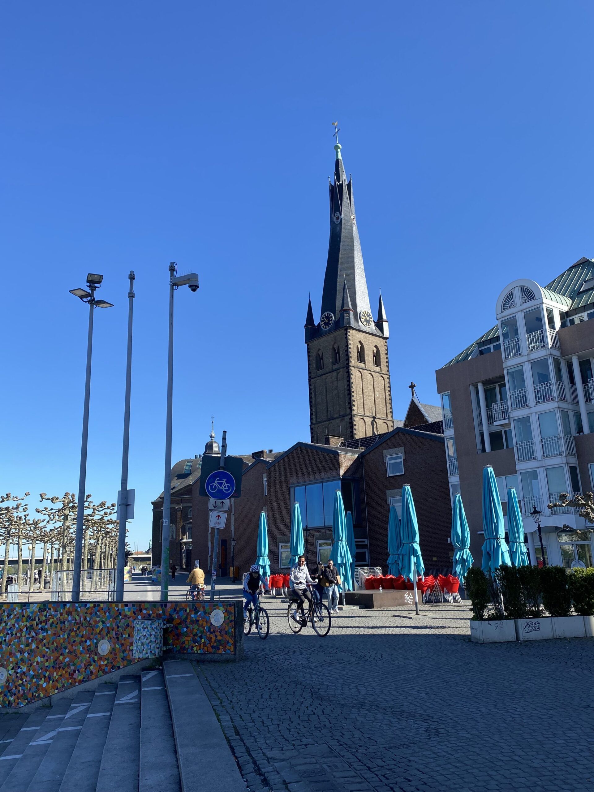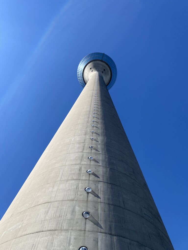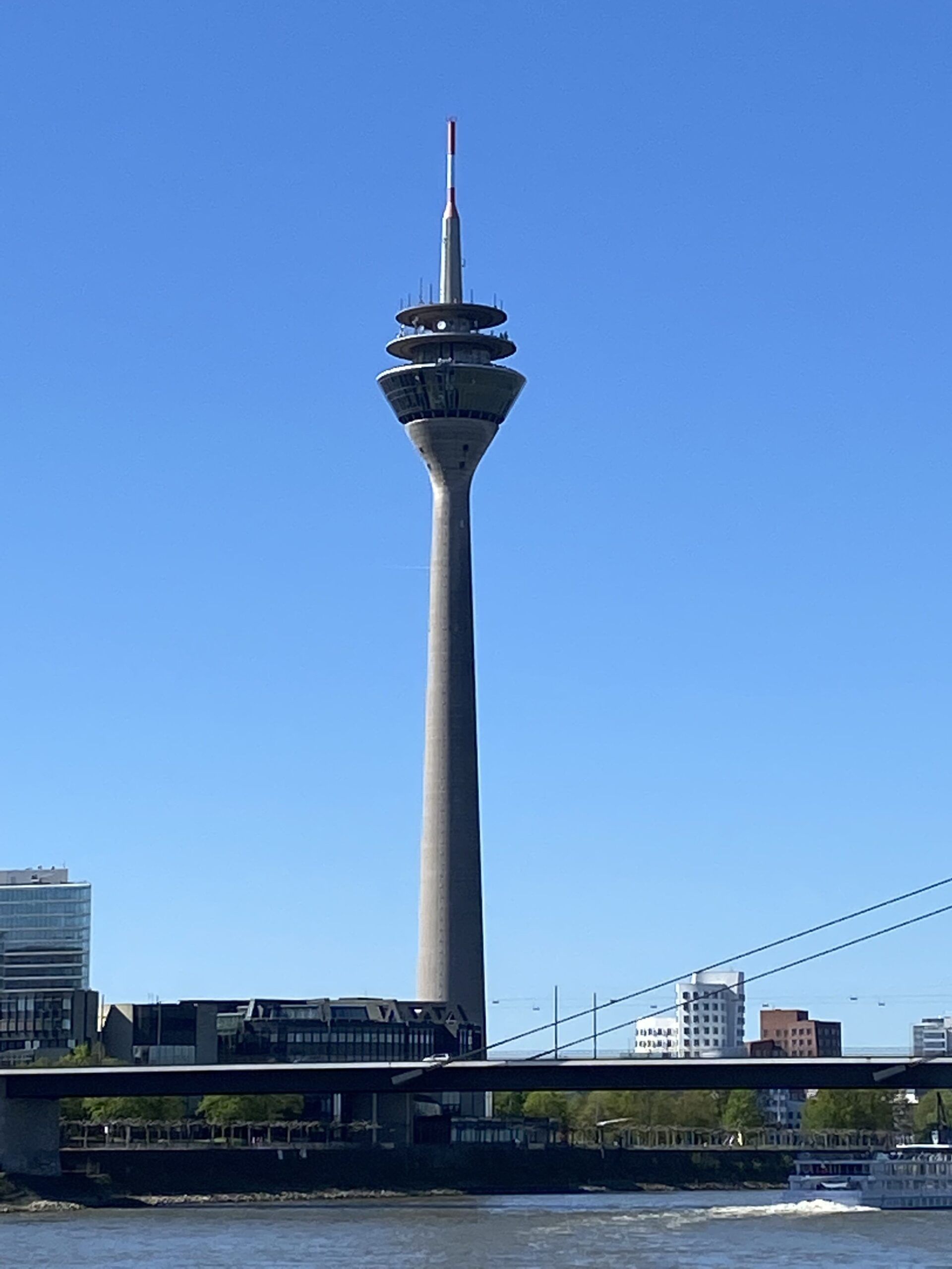 Para terminar la media jornada, volvimos al Rin y caminamos hacia la zona del Rheinturm (Rhine Tower). Si la mañana fue historia, esto es postal: el Rheinturm es el gran icono contemporáneo de la ciudad y su edificio más alto.