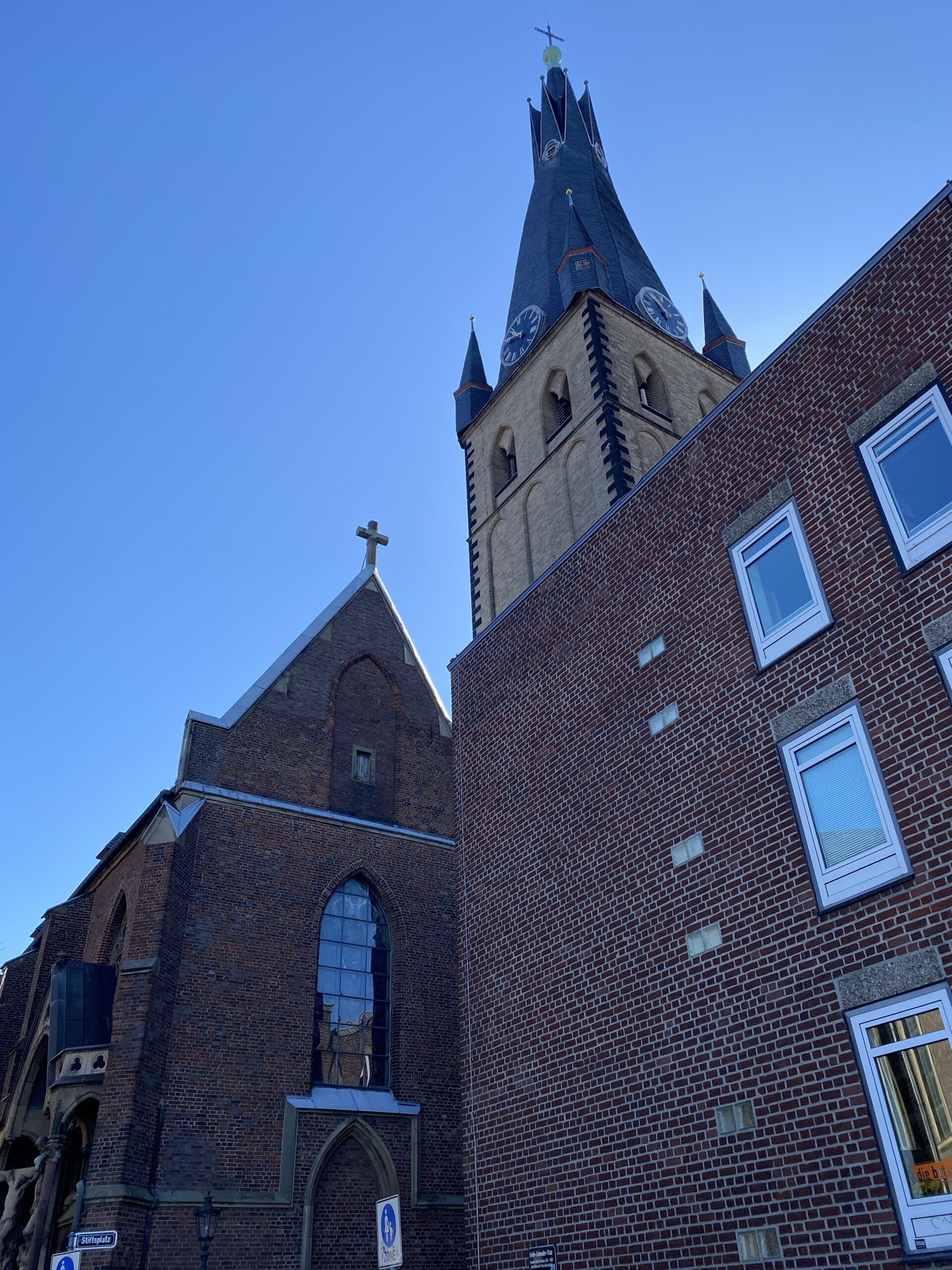 A pocos pasos tienes la Kirche St. Lambertus, uno de los iconos visuales del casco antiguo. Es una iglesia gótica de ladrillo del Bajo Rin, ligada al nacimiento de la ciudad, y su detalle más famoso es la aguja retorcida: tras un incendio en 1815 se reconstruyó y la madera se habría deformado; la leyenda local lo cuenta con más mala intención, diciendo que fue el diablo quien torció la torre.