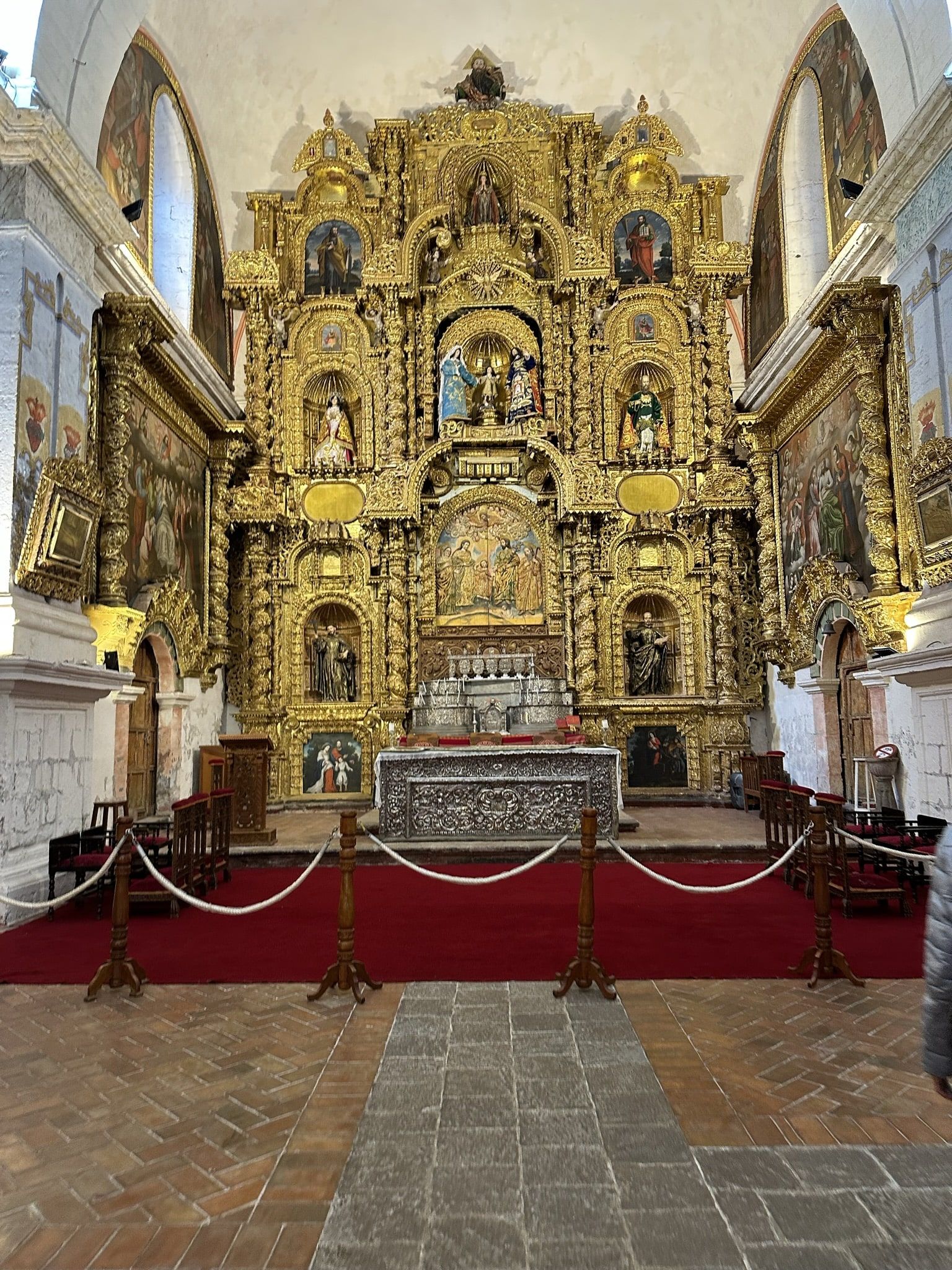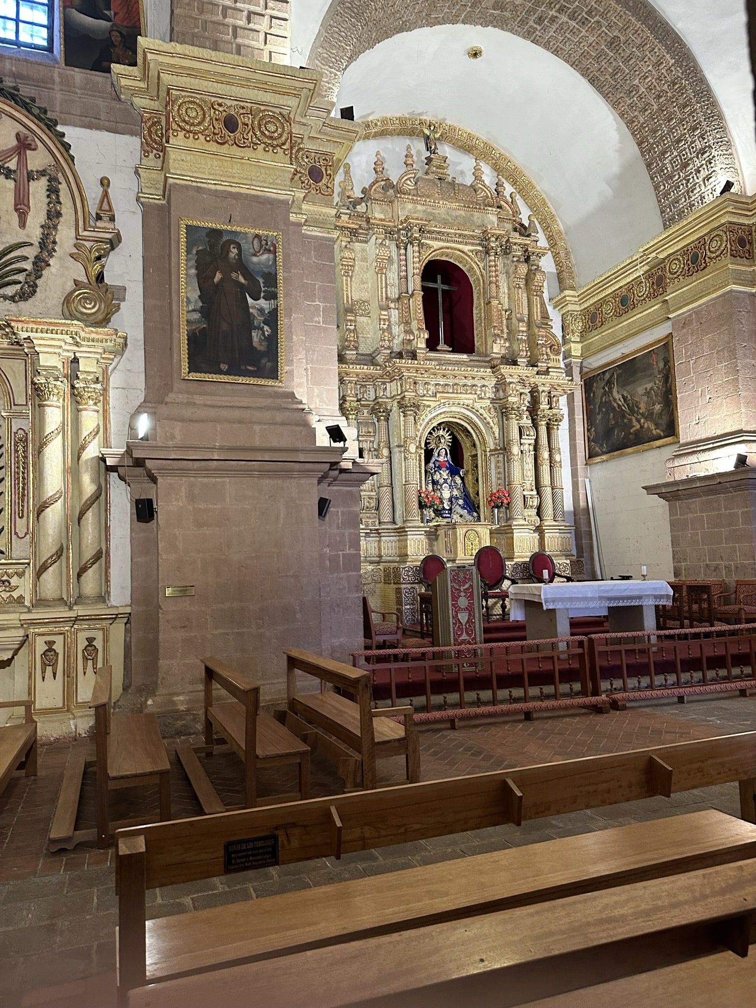 Uno de los elementos más llamativos es el retablo mayor, considerado uno de los más grandes del Perú, que se eleva más de veinte metros y está íntegramente recubierto de oro. En él se encuentra la imagen de la Virgen de la Inmaculada Concepción, rodeada de santos y ángeles mestizos. Bajo ese esplendor barroco, sin embargo, se conservan los cimientos del antiguo palacio inca. Como en toda la ciudad, el pasado prehispánico no fue borrado: fue sepultado y reaprovechado como base espiritual y material de la nueva era.
