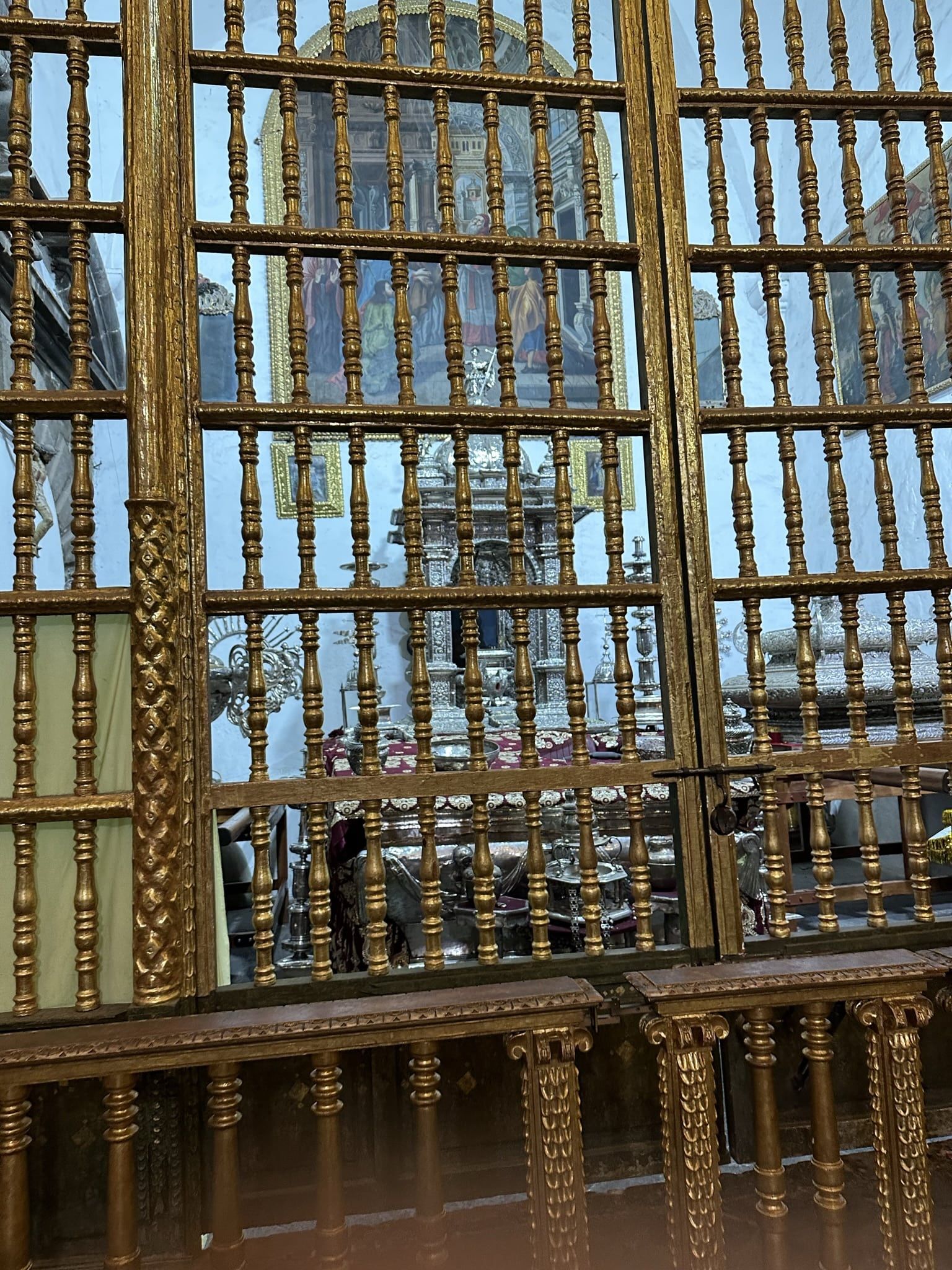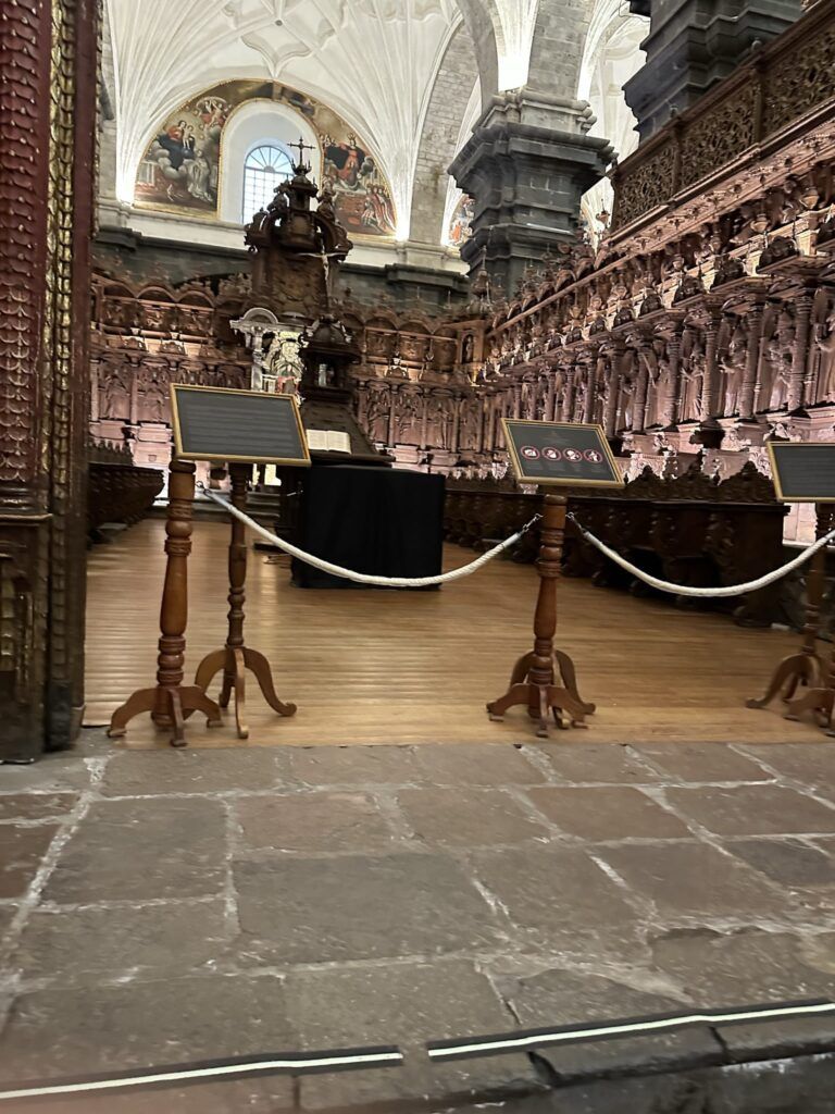 En contraste, el coro es una obra maestra de la talla en madera: más de un centenar de asientos ornamentados con figuras de santos, santas, mártires y apóstoles tallados por artesanos indígenas en el siglo XVII. Cada rostro tiene rasgos locales, un gesto que revela la apropiación andina del imaginario cristiano.