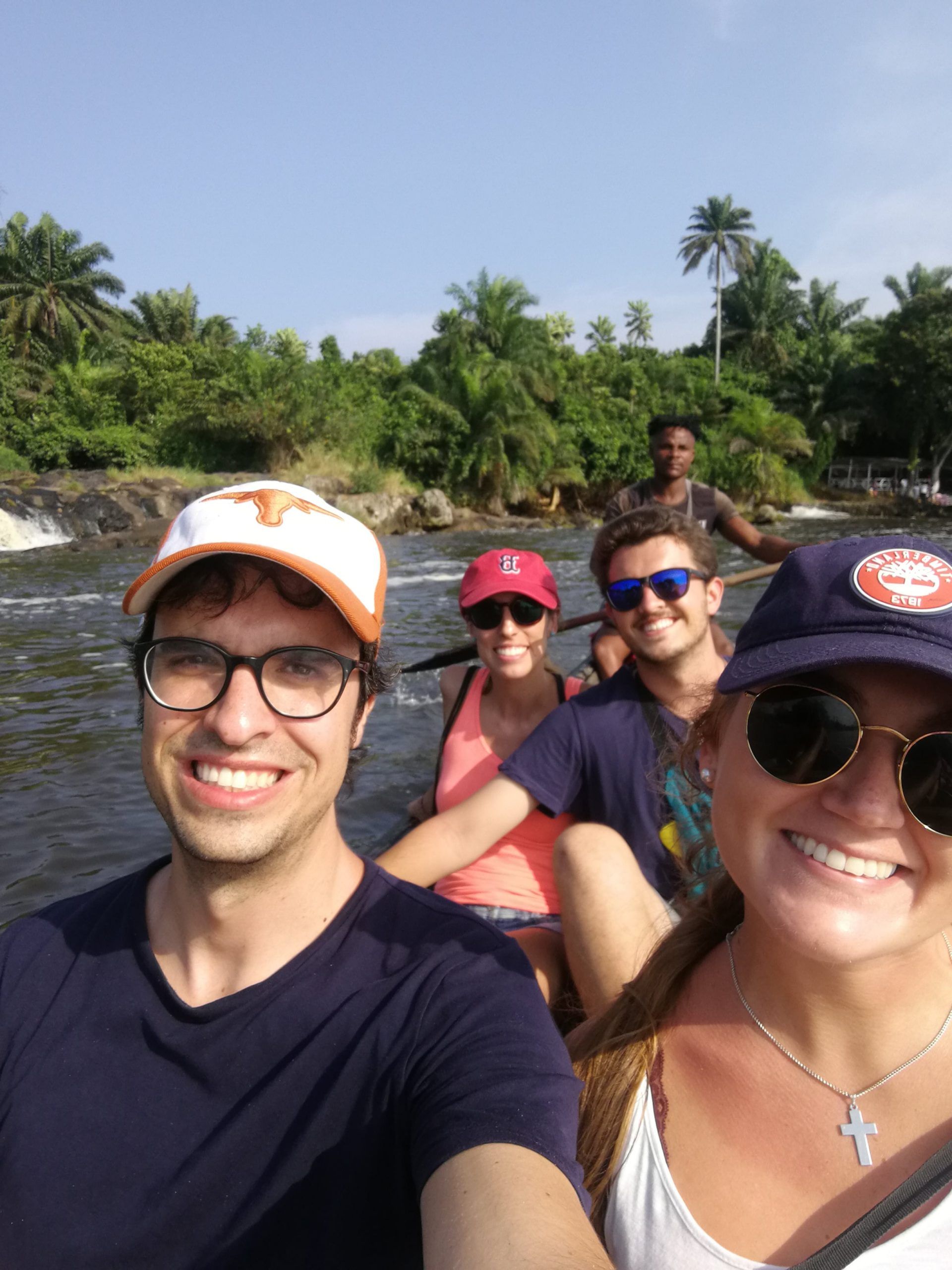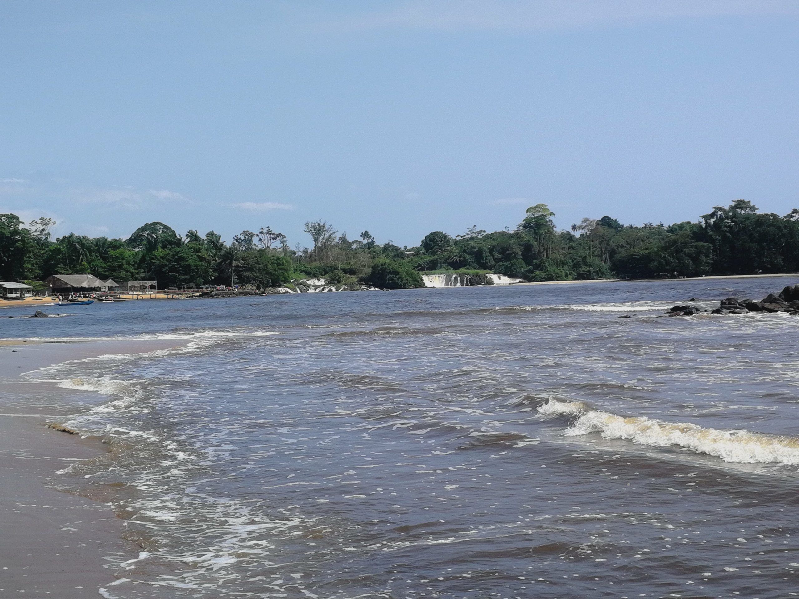 Al día siguiente pudimos disfrutar algo más de Kribi. Dimos un paseo por la playa unos 5km al sur hasta llegar al mayor punto de interés, “Chutes de la Lobe” que son una especie de cascadas en la desembocadura del río Lobe que caen directamente sobre el mar (las Iguazú de Kribi). Tienen cierto encanto aunque como viene siendo costumbre la aventura es llegar a verlas. Aquí negociamos un precio con un barquero que nos llevó en un cayuco para verlas de cerca. Lo bueno es que no tardó mucho en volver ya que todos los que ocupábamos la barca en ese momento temíamos que el agua iba a entrar en cualquier momento. En estos casos extremos sin chaleco salvavida es importante tener unas buenas nociones de nado.
