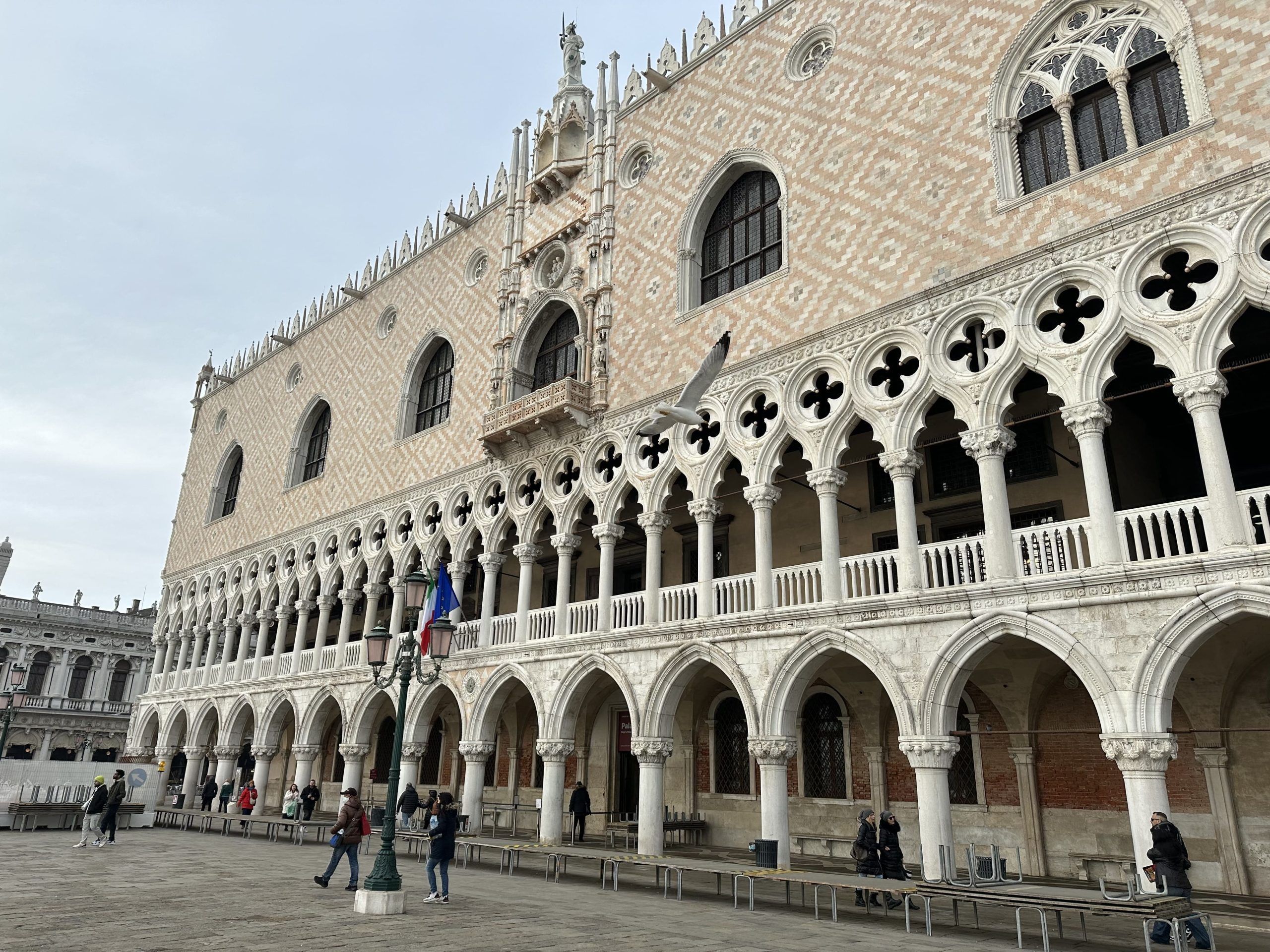 Es sin duda uno de los edificios más impresionantes de Venecia. Antigua Sede del Gobierno Veneciano, donde residían los llamados Dogos o Dux o Duques de Venecia, se consideraba el magistrado supremo y máximo dirigente de Venecia durante más de mil años (SVIII al SXVIII). El Palazzo es de un estilo veneciano único, realizado con piedra blanca de Istria (región de Croacia que luego visitaremos) y mármol rosa de Verona, el palacio se posa sobre una elegante arcada con capitales medievales de carácter gótico.