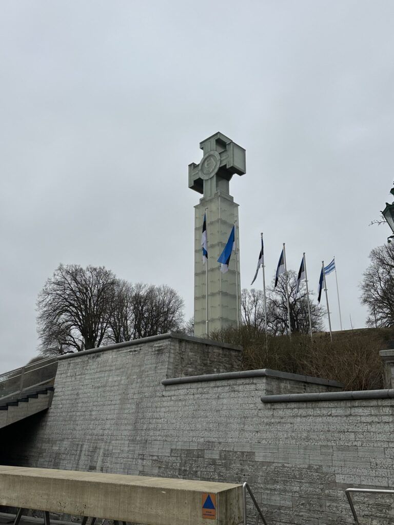 El guía nos explicó que esta plaza, hoy un punto de encuentro para conciertos y celebraciones nacionales, ha cambiado de nombre y de función tantas veces como invasores ha tenido Estonia. Durante la ocupación rusa (Plaza de Pedro), la nazi y después la soviética (la Plaza de la Victoria), el espacio se transformó para reflejar los ideales de cada régimen. Hoy, sin embargo, la plaza rinde homenaje a la independencia estonia, con una gran cruz iluminada que recuerda a los caídos en la Guerra de la Independencia (1918–1920) y también hace un guiño a su origen medieval.