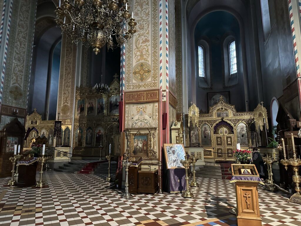 Entrar en la catedral fue como hacer un viaje a otro mundo. El olor a incienso, las lámparas colgantes y los fieles encendiendo velas creaban una atmósfera que nos trasladaba directamente a Moscú o San Petersburgo. No se pueden hacer fotos dentro.