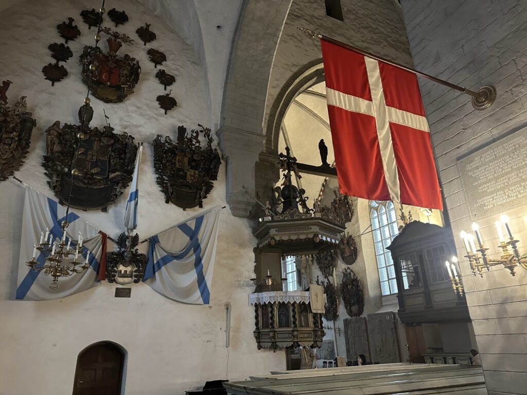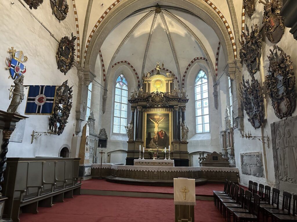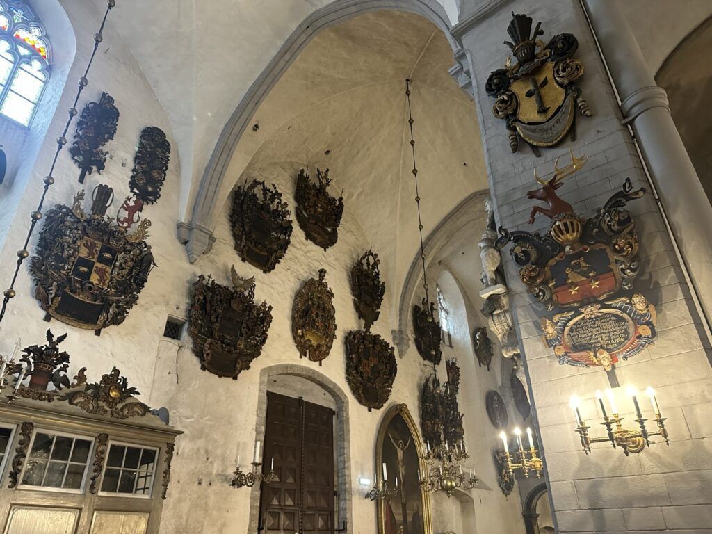 Lo que más me sorprendió fue el ambiente de sobriedad nórdica: nada de colores brillantes ni mosaicos, sino un espacio luminoso y austero, propio de la tradición luterana. Sin embargo, los detalles hacen que sea única. En las paredes cuelgan decenas de escudos heráldicos de las familias nobles báltico-alemanas que vivieron aquí durante siglos. Cada uno cuenta una historia: linajes que controlaban el comercio, caballeros de la Liga Hanseática, burgueses que hicieron fortuna con el mar Báltico.