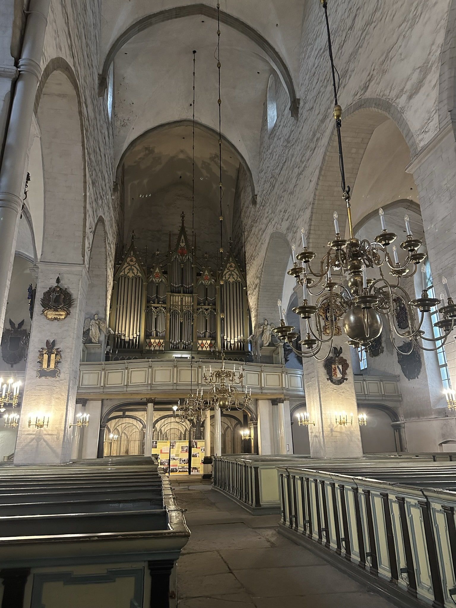 Lo que más me sorprendió fue el ambiente de sobriedad nórdica: nada de colores brillantes ni mosaicos, sino un espacio luminoso y austero, propio de la tradición luterana. Sin embargo, los detalles hacen que sea única. En las paredes cuelgan decenas de escudos heráldicos de las familias nobles báltico-alemanas que vivieron aquí durante siglos. Cada uno cuenta una historia: linajes que controlaban el comercio, caballeros de la Liga Hanseática, burgueses que hicieron fortuna con el mar Báltico.