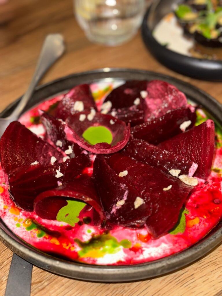 En la foto se puede ver una ensalada georgiana de remolacha. Suele servirse con nueces trituradas y a veces con crema agria o yogur, ya que en la gastronomía georgiana las ensaladas con remolacha y salsas a base de nueces son muy comunes.