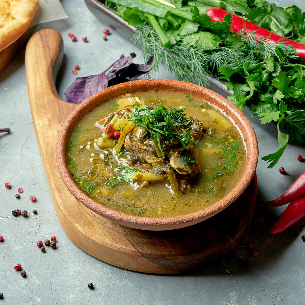 El chakapuli es uno de los estofados más emblemáticos de Georgia. Se elabora tradicionalmente con cordero o ternera, cocinado a fuego lento con estragón fresco, vino blanco georgiano y ciruelas verdes ácidas (tkemali). Estos ingredientes le dan un sabor muy particular: herbal, ligeramente ácido y a la vez reconfortante. Es típico prepararlo en primavera, cuando abundan las hierbas frescas y las ciruelas, por lo que muchos lo consideran el “plato de temporada” que inaugura el buen tiempo en Georgia.