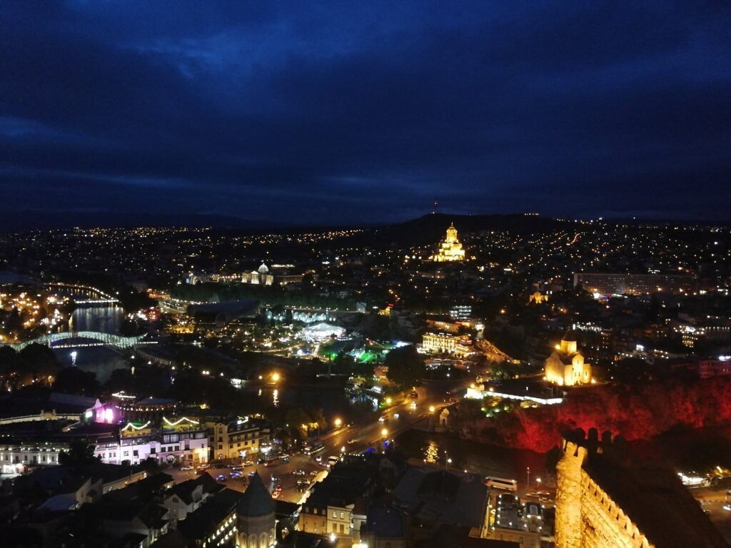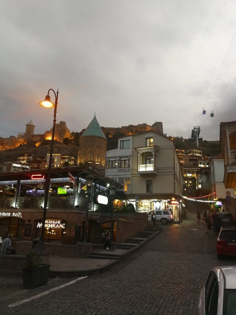La ciudad cobra una nueva vida al caer el sol. En la zona de Sharden Street abundan bares, terrazas y restaurantes con música en vivo, mientras las murallas de Narikala y el Puente de la Paz se iluminan creando un ambiente mágico.
