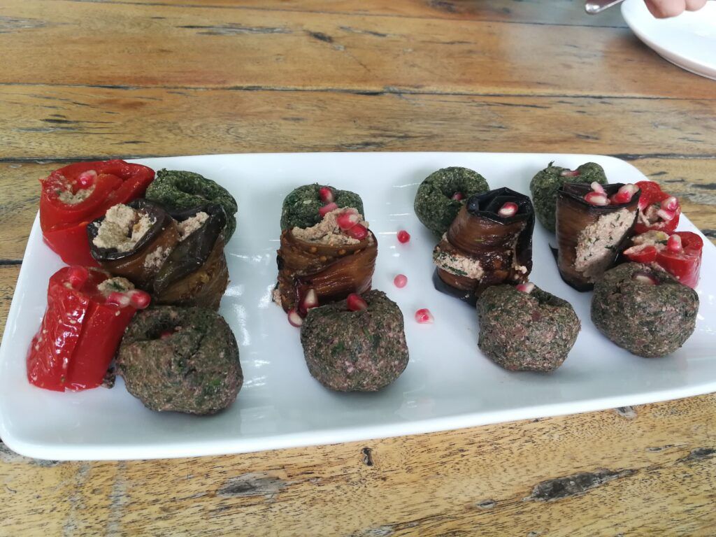 El pkhali son pequeñas bolas o pasteles fríos elaborados con verduras picadas (espinacas, remolacha, col, berenjena, pimiento rojo…) mezcladas con una pasta de nueces, ajo, cilantro y especias. Suelen decorarse con semillas de granada, que aportan frescor y contraste ácido. En el plato de la foto se ven diferentes variedades como pimientos rellenos de nueces, berenjenas enrolladas con pasta de nueces y bolas de espinaca o remolacha con nueces y hierbas.