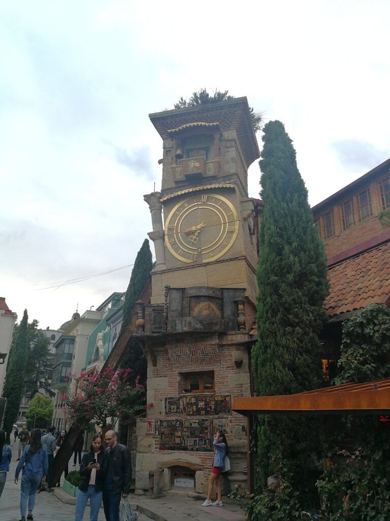 La torre fue diseñada por el artista, pintor y director de cine georgiano Rezo Gabriadze, fundador del teatro de marionetas que lleva su nombre. No es una torre medieval, aunque lo parezca: fue levantada en 2010 y desde entonces se ha convertido en un icono fotográfico de la ciudad. Su estilo mezcla ladrillo, madera, azulejos pintados a mano y elementos asimétricos que la hacen parecer una construcción de fantasía.