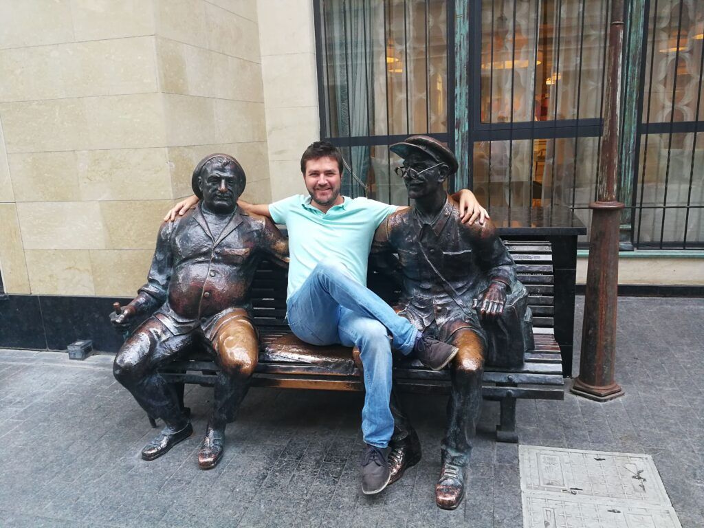 En una callejuela del centro encontramos otra obra muy popular: la escultura de los escritores Ilf y Petrov. Representados sentados en un banco, estos autores soviéticos célebres por su novela satírica Las doce sillas invitan a los transeúntes a sentarse junto a ellos y tomarse una foto, lo que la convierte en un punto de encuentro lleno de humor y cercanía.
