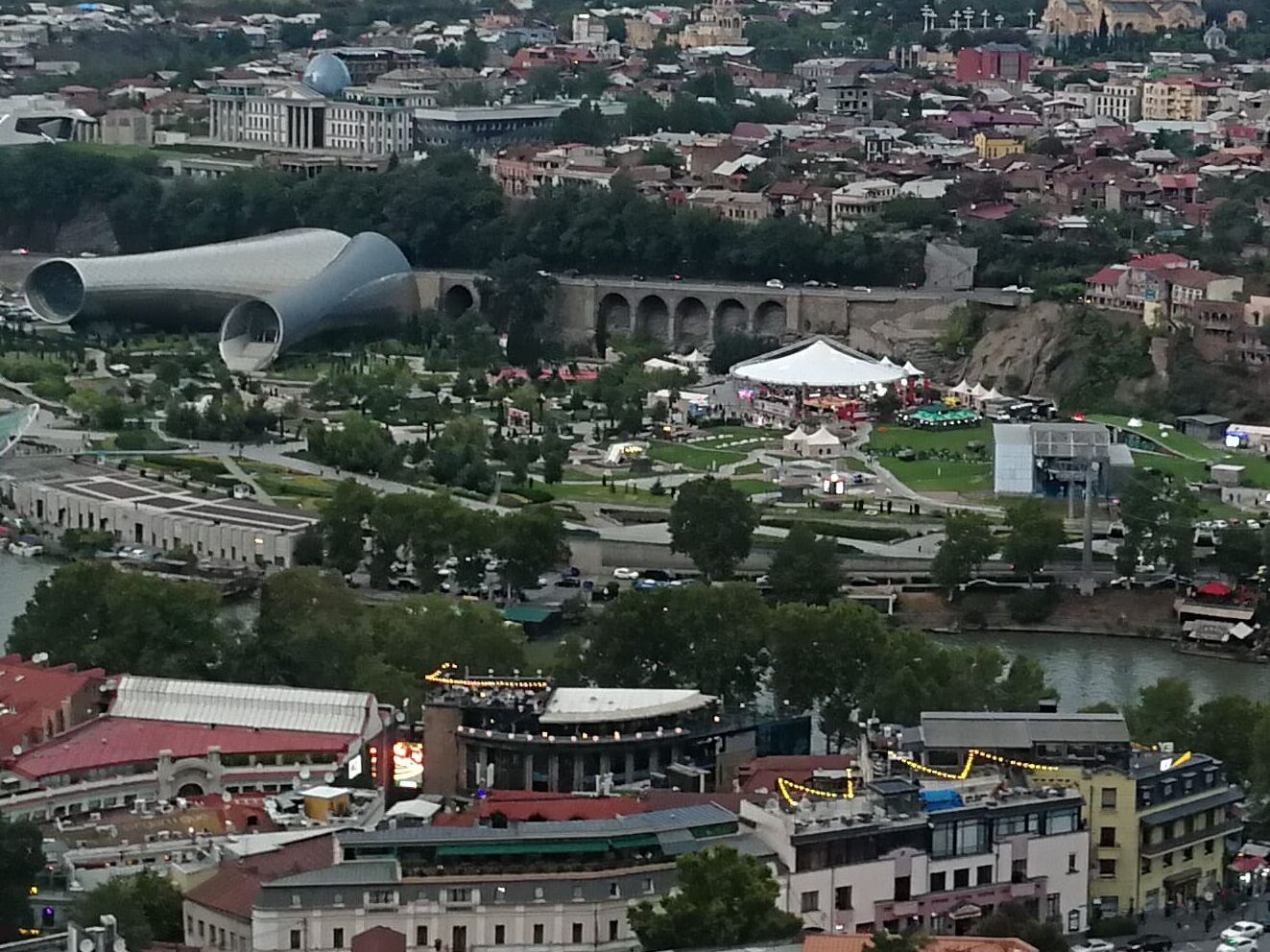 Desde el Parque Rike parte un teleférico que en pocos minutos te lleva hasta la fortaleza de Narikala y la estatua de Kartlis Deda, la Madre de Georgia. El trayecto ofrece vistas panorámicas inolvidables sobre el río, el casco histórico y el Puente de la Paz.