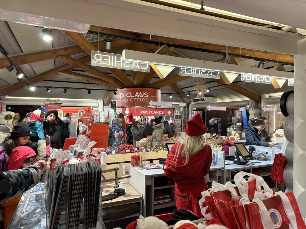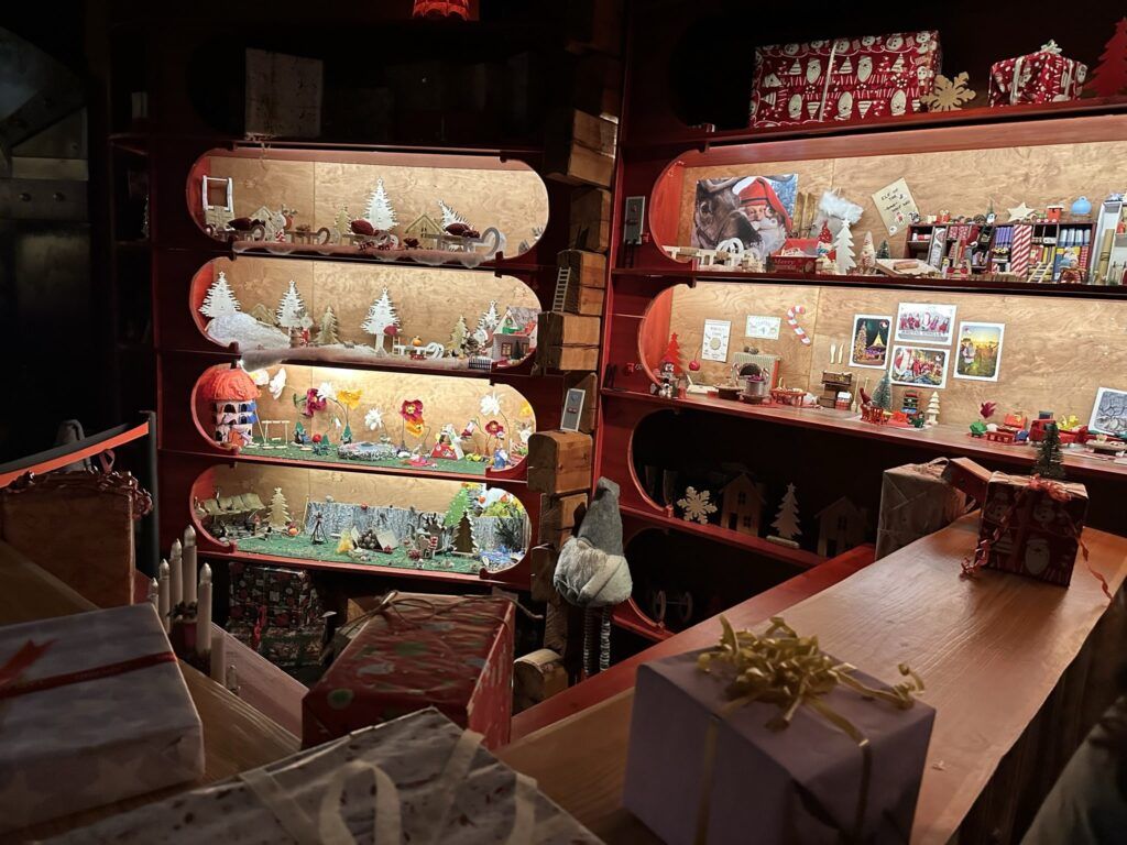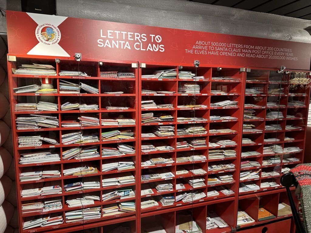 El interior está lleno de cartas reales llegadas de todos los países imaginables. No es decoración: son envíos auténticos. Este detalle refuerza la sensación de que Santa Claus Village no es solo un decorado, sino un lugar activo, vivo, con una función concreta durante todo el año.