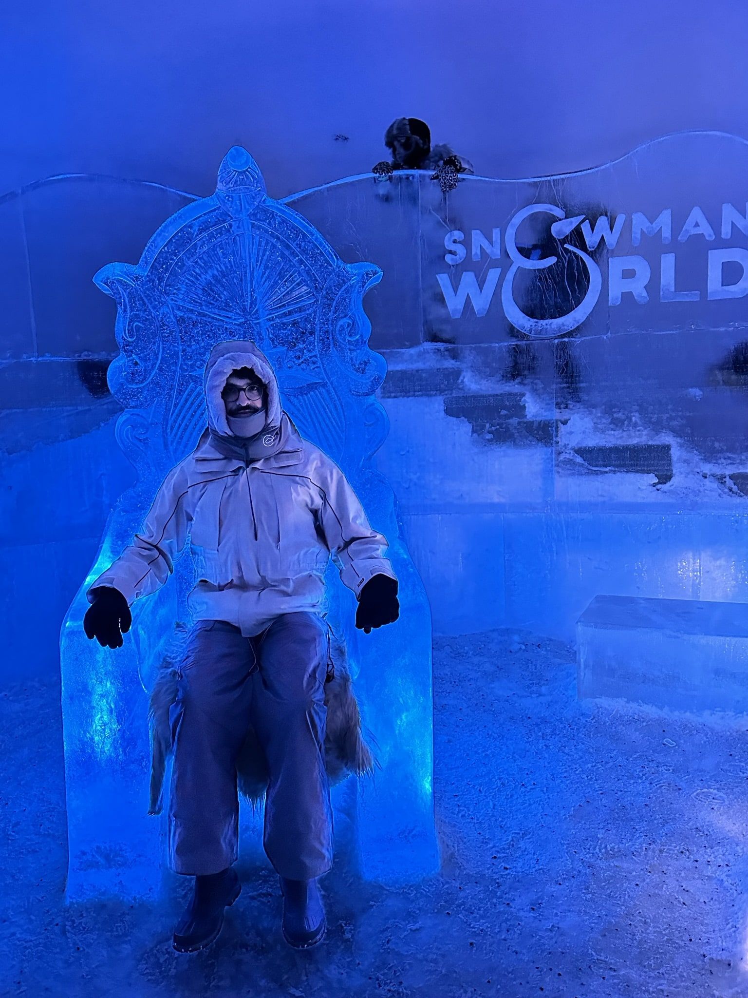 Dentro de Snowman World se encuentra el Ice Restaurant & Ice Bar, un espacio que no busca sorprender por la cocina, sino por el acto de comer en un entorno completamente congelado. Aquí todo —paredes, mesas, bancos, barras— está construido con hielo y nieve compactada, siguiendo el mismo concepto efímero del parque: se levanta cada invierno y desaparece cuando llega el deshielo.