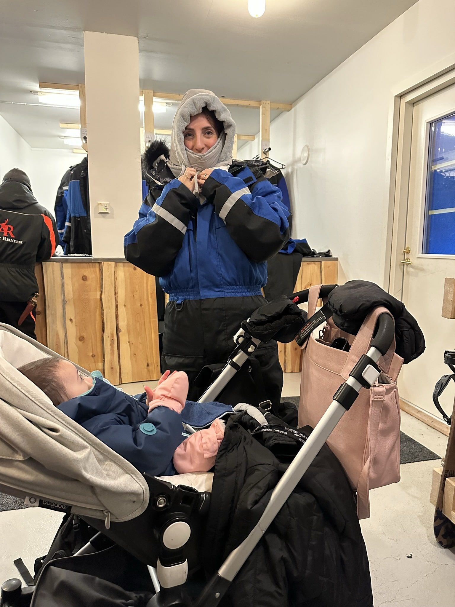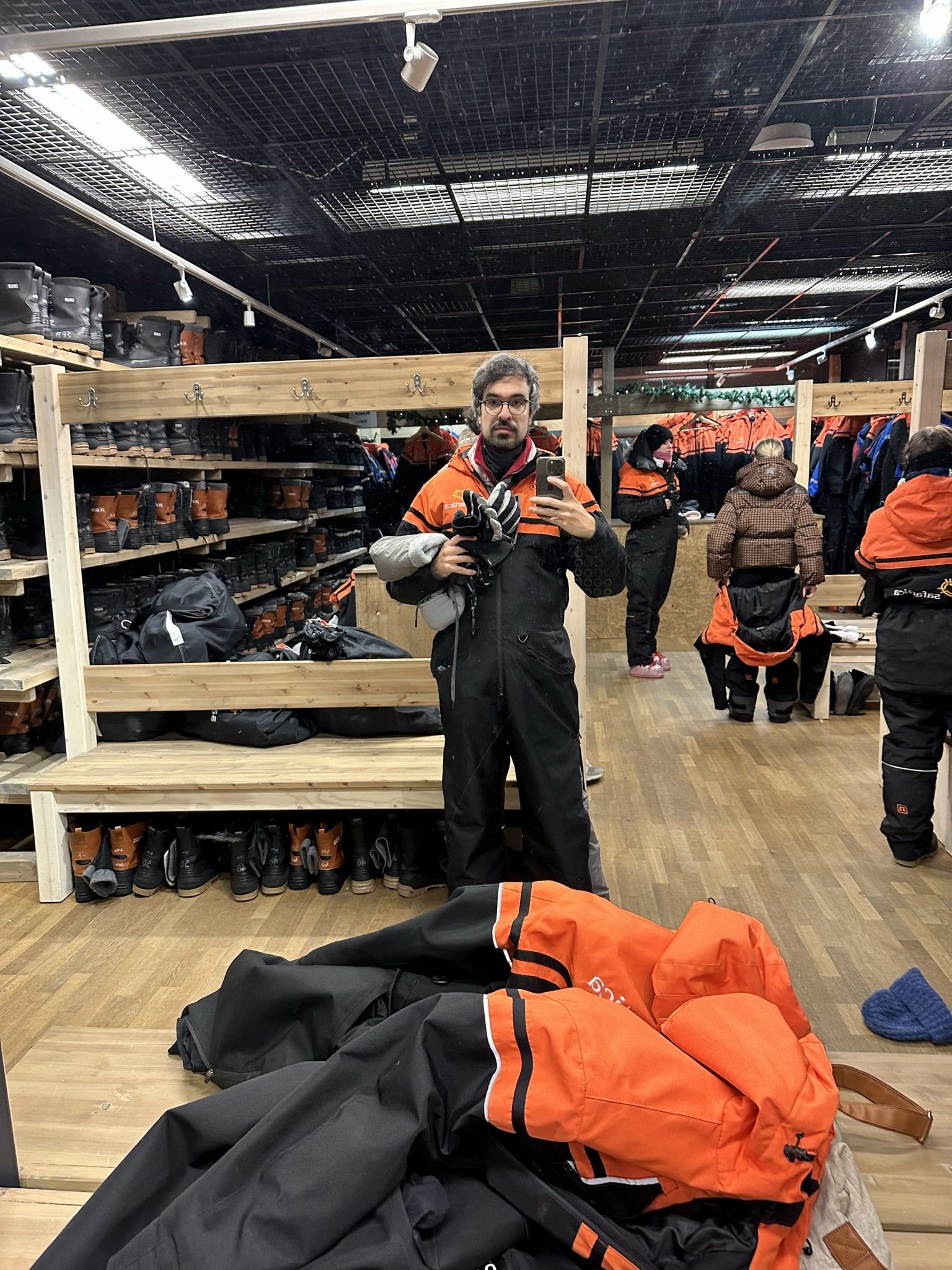 Nada más llegar, lo primero no fue ver renos ni huskies, sino prepararnos. Nos entregaron equipaciones especiales contra el frío: monos térmicos enormes, botas reforzadas, guantes gruesos. Vestirse allí fue casi un ritual. Capa sobre capa, cierres bien ajustados, sensación inmediata de aislamiento y un gran calor en interiores.