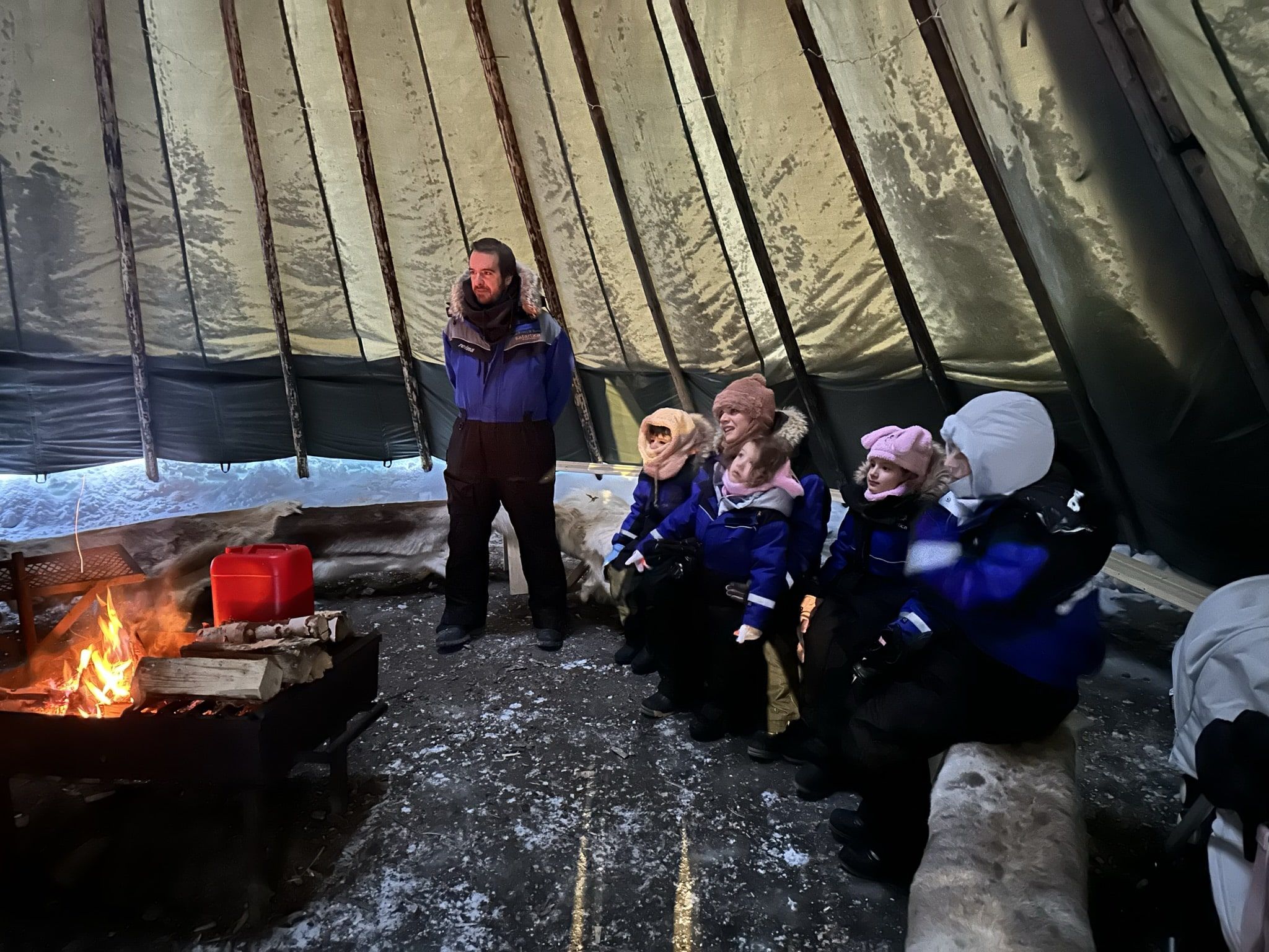 Entre actividades, cuando el cuerpo empieza a notar el desgaste del frío, nos llevaron a una lavvu, una tienda tradicional sami, similar a un tipi. Dentro, el cambio es inmediato. Un fuego encendido en el centro, bancos de madera alrededor, luz cálida. Nos ofrecieron café o té caliente y unas galletas sencillas. Nada elaborado, nada innecesario. En ese momento, ese calor básico lo era todo.