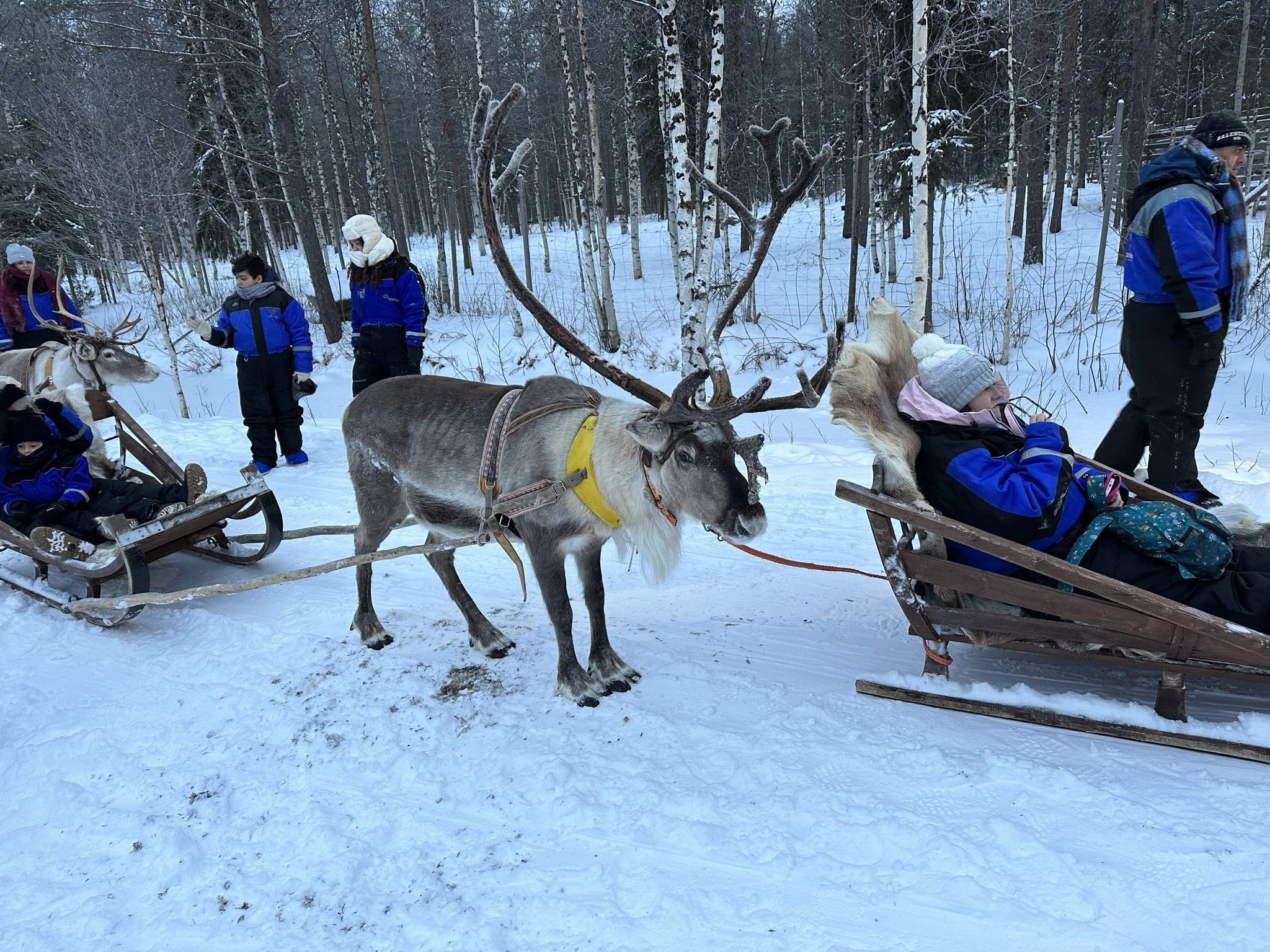 A –15 °C todo parece más lento. Nos sentaron en un trineo con capacidad para dos personas (y el bebé bien protegido) que era arrastrado (muy) tranquilamente por un reno de tamaño imponente que, junto con el resto de renos y trineos, dimos una vuelta de unos 10-15 minutos de duración. A esas temperaturas, tampoco pides estar mucho más tiempo fuera de lo normal. Se trata de una experiencia muy asequible para cualquier edad y público.