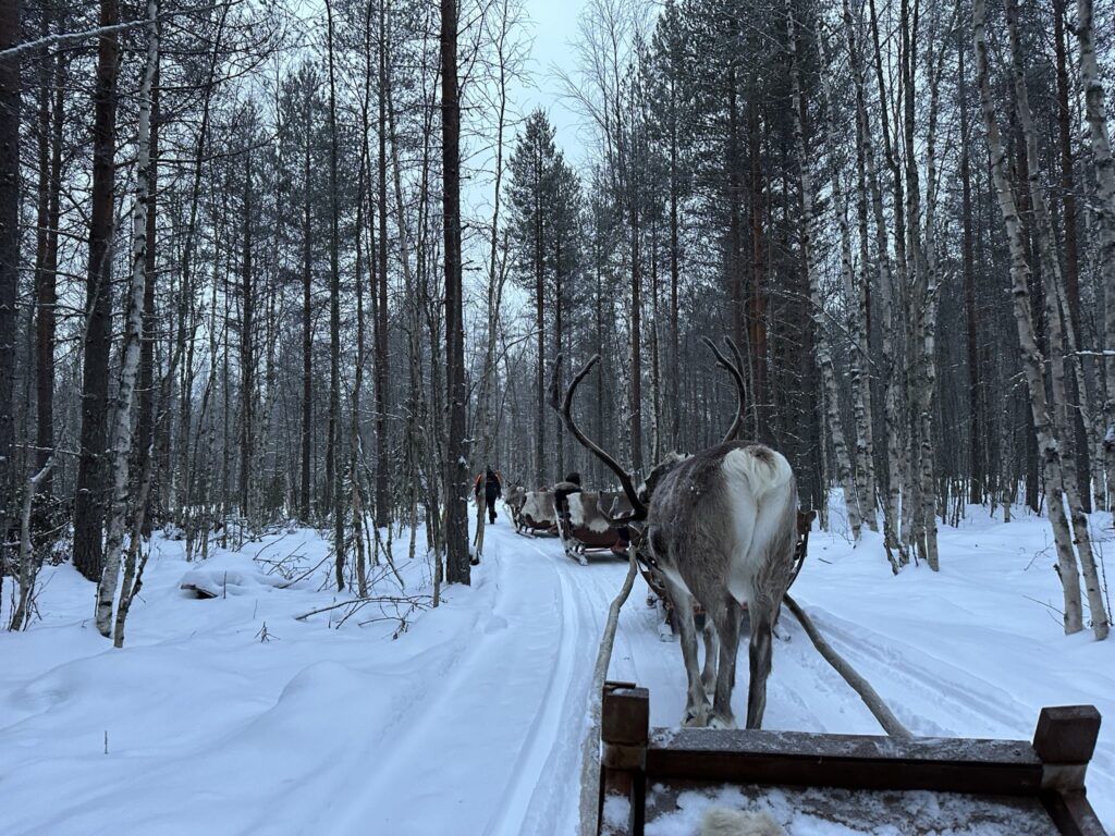 El primer encuentro fue con los renos. Aparecen sin anunciarse, tranquilos, casi indiferentes a nuestra presencia. El guía habla en voz baja, explica su relación histórica con la región, cómo viven el invierno, cómo se mueven cuando todo se congela. Nos contaron algunas curiosidades como que les crecen los cuernos a un ritmo de un metro por año. Hay renos con cuernos y otros no. Y las hembras los suelen tener más grandes con el fin de proteger a los bebés. Están en una situación de semi libertad, donde cada uno de ellos tienen propietario.