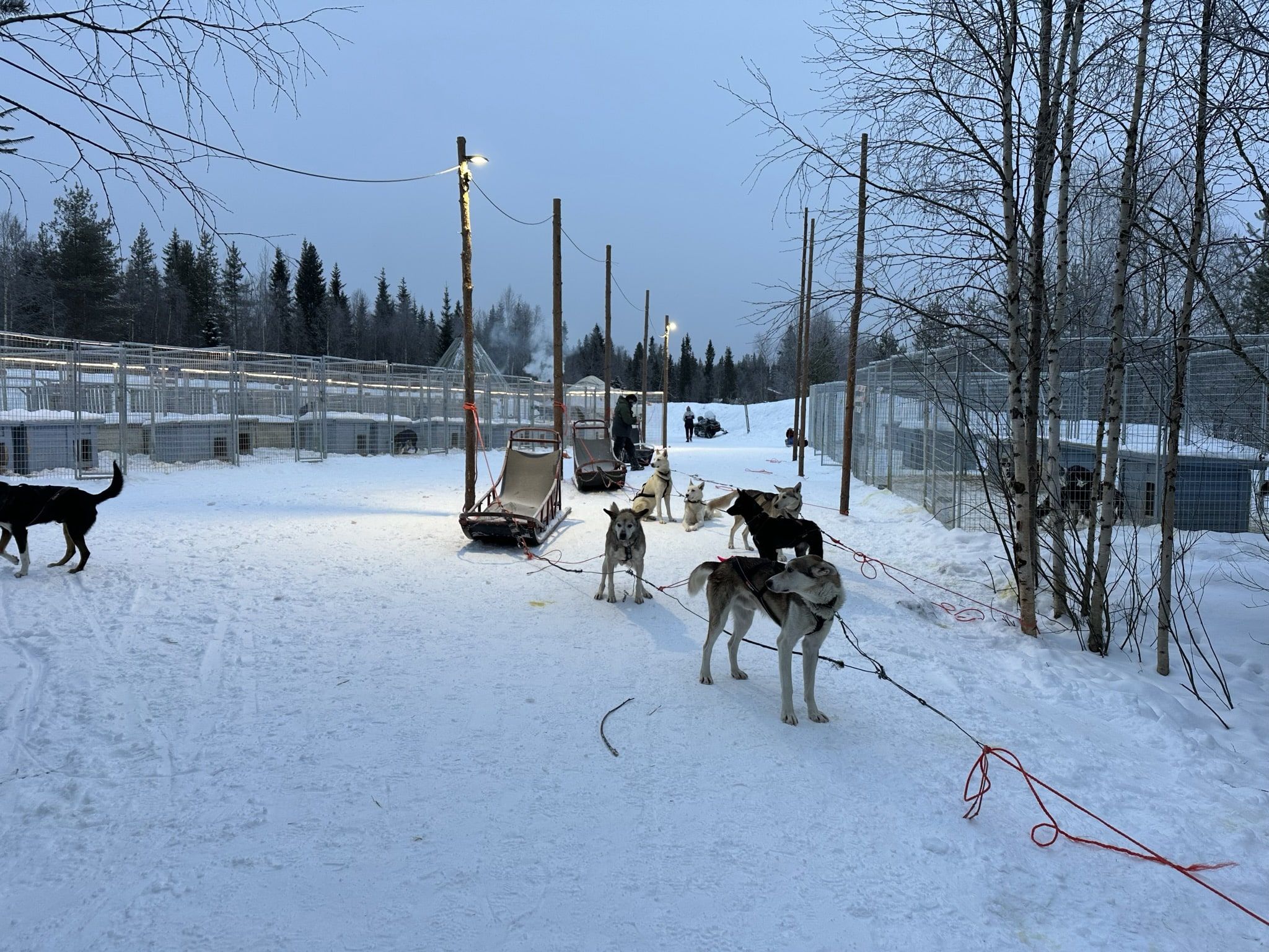 Antes de subir al trineo hubo una explicación clara y directa. Cómo colocarse, cómo comportarse, qué esperar. Era la tercera vez que me subía en un trineo con huskies, y cada experiencia ha sido diferente. Las otras veces pude llevar el trineo, lo cual lo hace mucho más interesante y divertido. Esta vez tocaba relajarse y disfrutar del paisaje más invernal posible. No fue una mala elección y pudimos repetir dos veces porque algunos miembros de la familia eligieron no hacerlo. El viaje también es corto, de unos 15 minutos, pero la distancia recorrida es mucho mayor, pasando del bosque a un lago helado enorme, y luego vuelta a la casilla de salida.