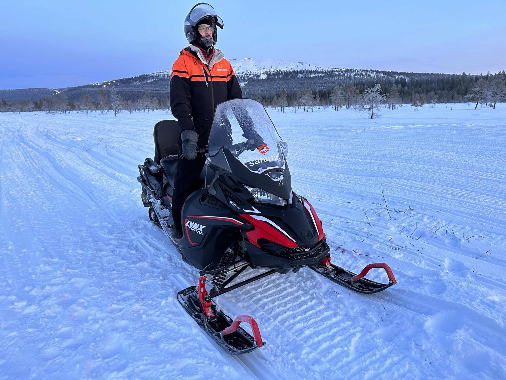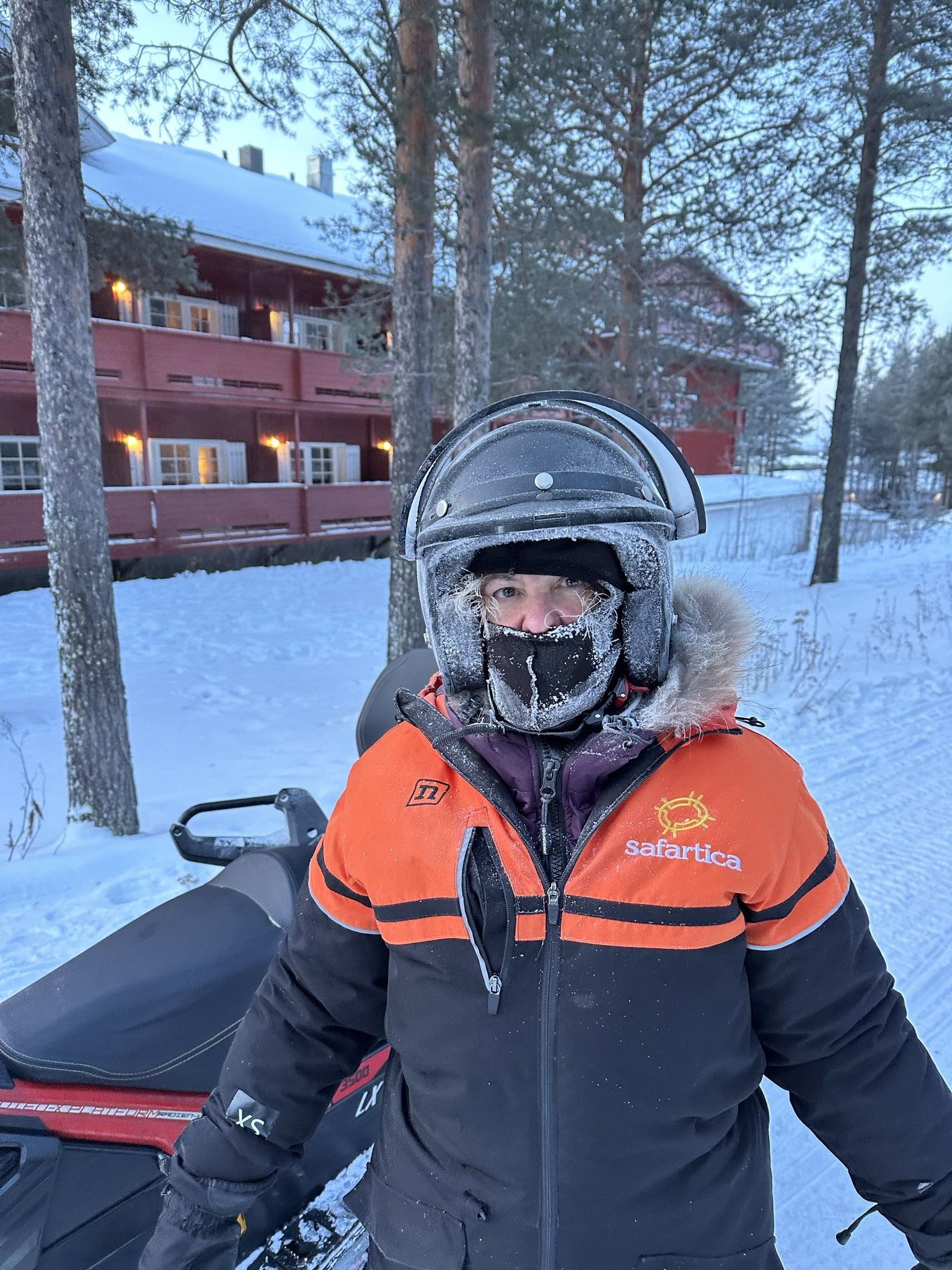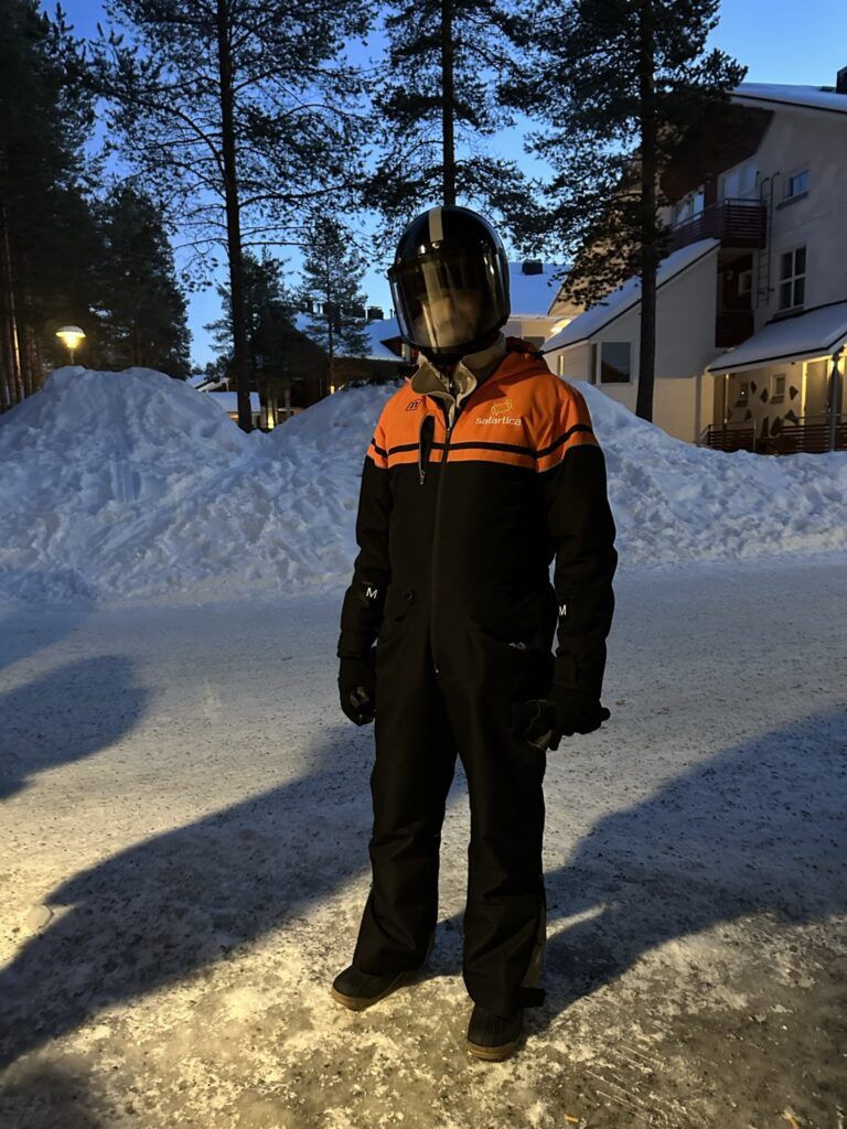 Nada más llegar al puesto de motos de nieve nos entregaron el equipamiento: mono térmico, gafas, botas, doble guantes, casco. Aun así, cuando te ajustas la braga al cuello sabes que va a colarse aire por algún sitio. Y se cuela. O se empañan las gafas y tienes que volver a ponértelas. E incluso solo con respirar, te está entrando un aire gélido directamente a los pulmones.