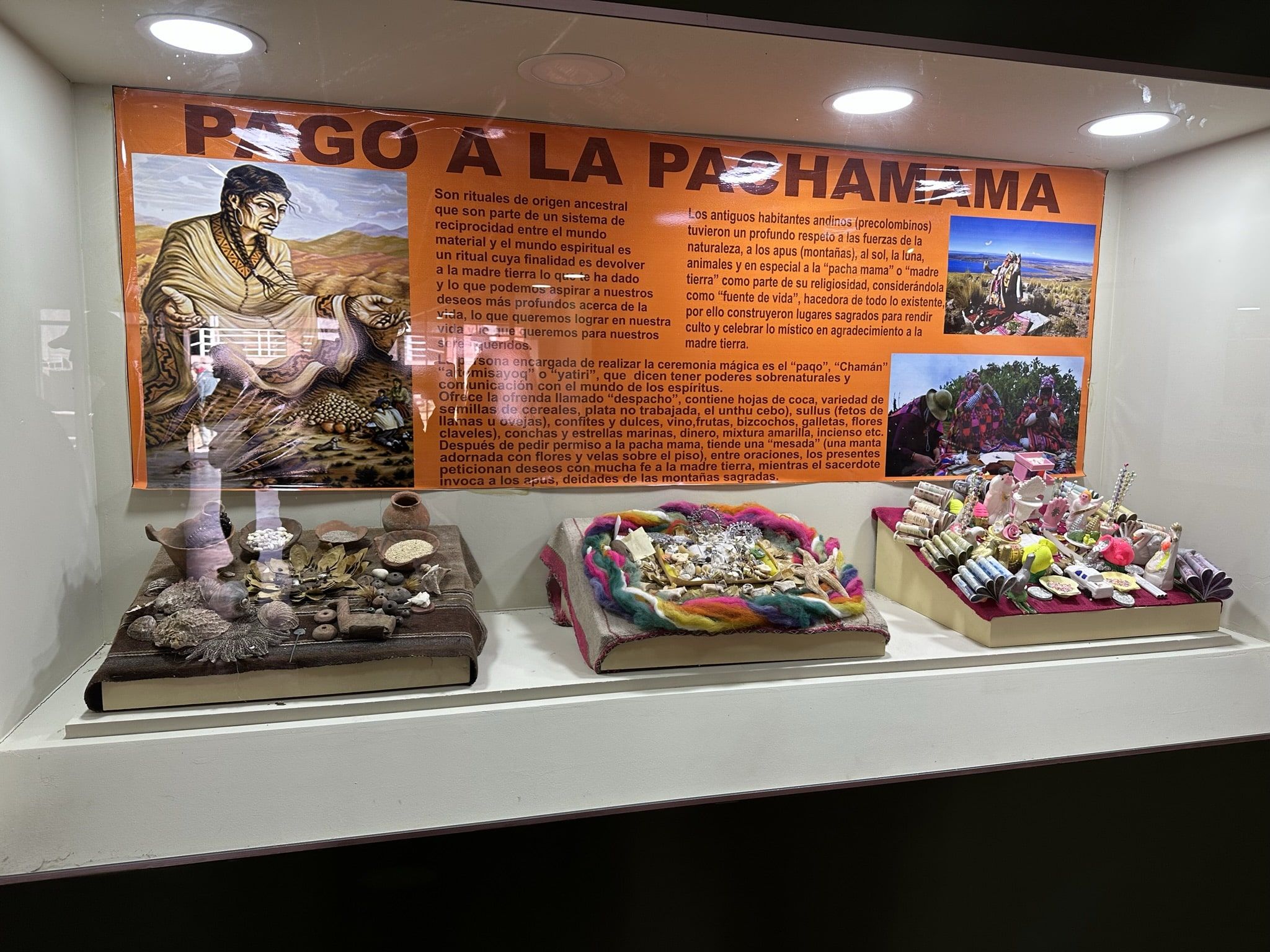 Ofrendas a la Pachamama: pudimos ver descritos aquellos rituales realizados por los habitantes andinos, con un profundo respeto a la naturaleza, a los apus (montañas), sol, la luna, etc, y en especial, a la madre tierra o la Pachamama, como parte de su religiosidad, considerándola como fuente de vida. Para ello, construyeron lugares sagrados para rendirle culto y celebrar lo místico.