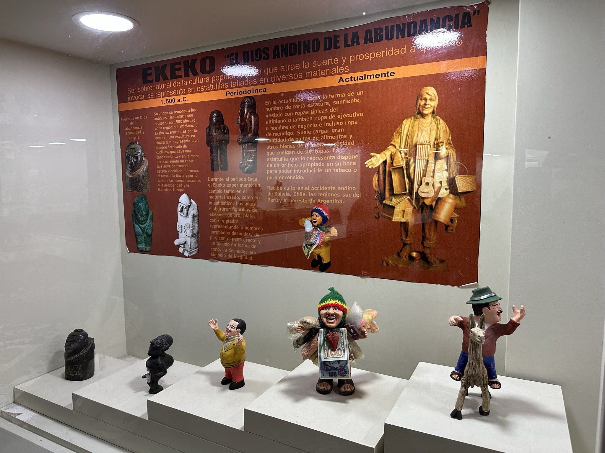 El Ekeko: un muñeco de corta estatura, sonriente, vestido con ropas típicas del altiplano, o como vimos en Bolivia, vestido de billetes. Suele cargar gran cantidad de bultos de alimentos y otros bienes. La estatuilla tiene un orificio en la boca para poder introducirle un tabaco o puro encendido. En resumen, otro amuleto de la suerte que lleva estando en la cultura andina desde 1500 a.C. considerándose un Dios de la abundancia, fecundidad y alegría. Dispone hasta de una oración, y decálogo y procedimiento para cuidarlo.