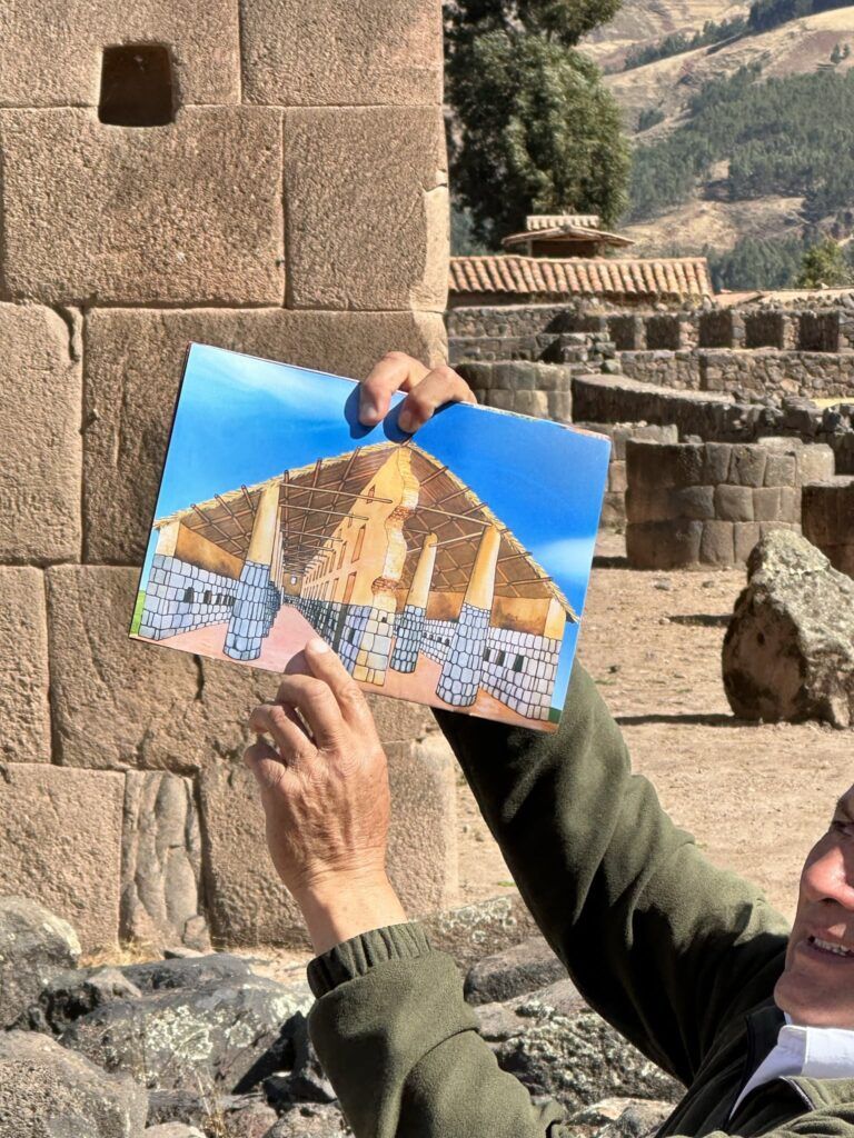 Alrededor del templo se encuentran más de recintos dispuestos de forma ordenada, que habrían servido como viviendas de sacerdotes, almacenes (qollqas) y espacios para peregrinos. Las bases de piedra y los muros de adobe muestran el característico estilo inca: sólido, simétrico y armonioso.