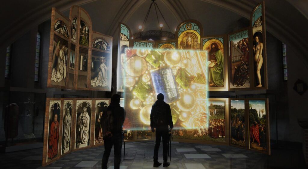 A continuación, te enseñan cómo Joos Vyd y Elisabeth Borluut, miembros de la alta clase de Gante, financian y ordenan la confección del retablo. Se proyecta una imagen en movimiento del estudio y taller de Jan Van Eyck, donde éste está trabajando en el retrato de Joos Vyd (que se integrará en el retablo cerrada, en el panel inferior izquierdo).
