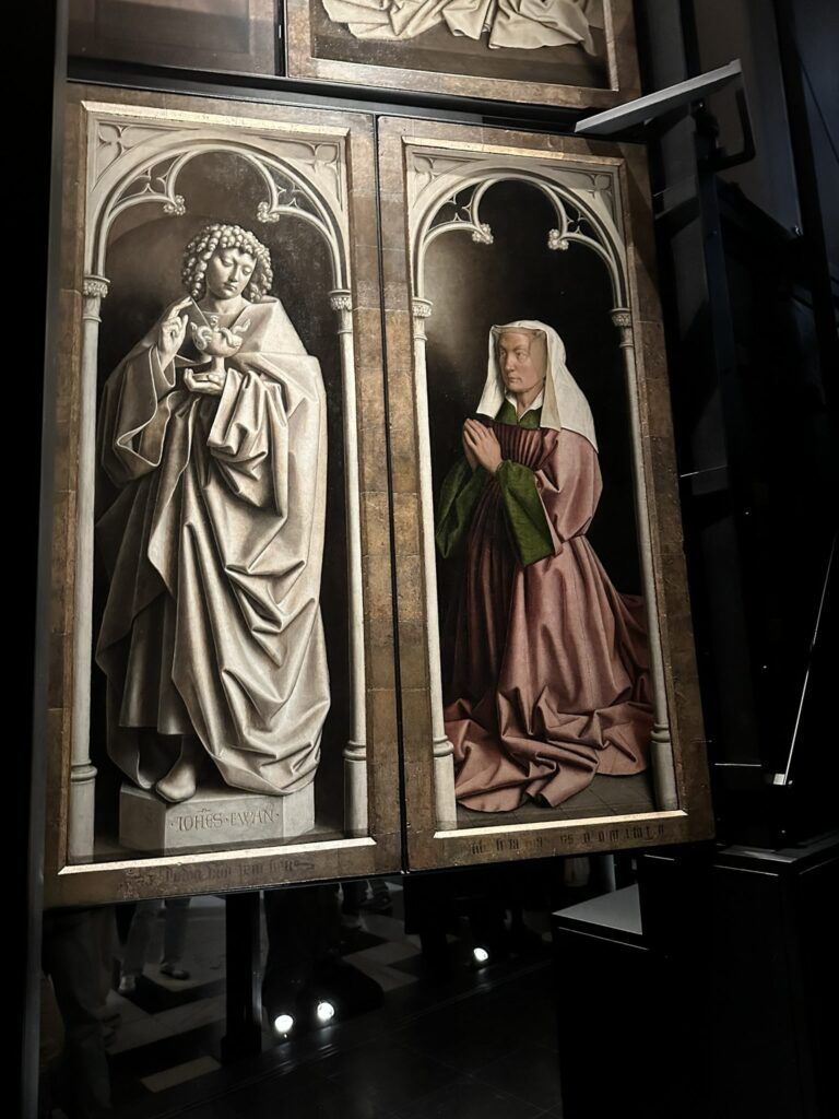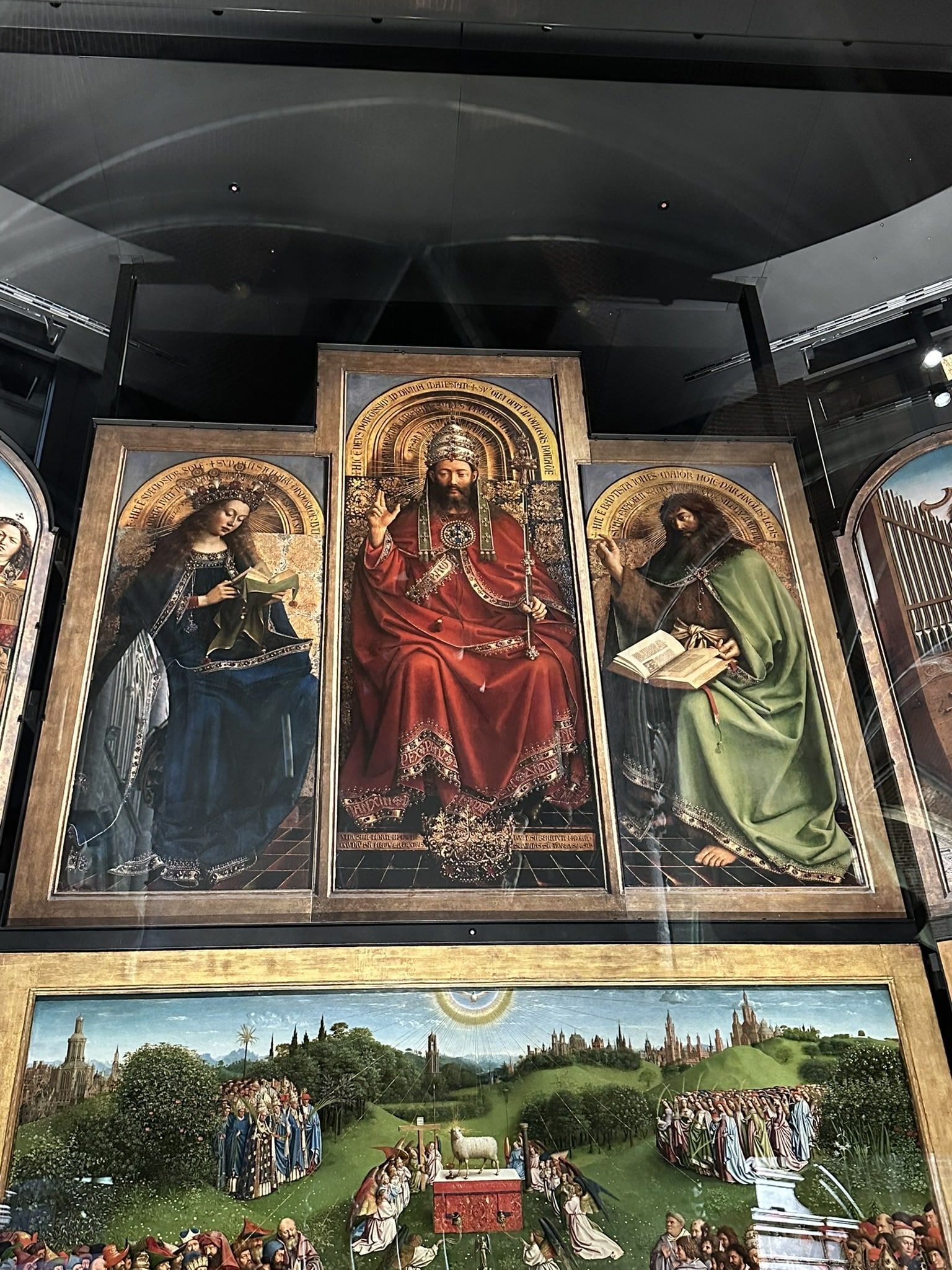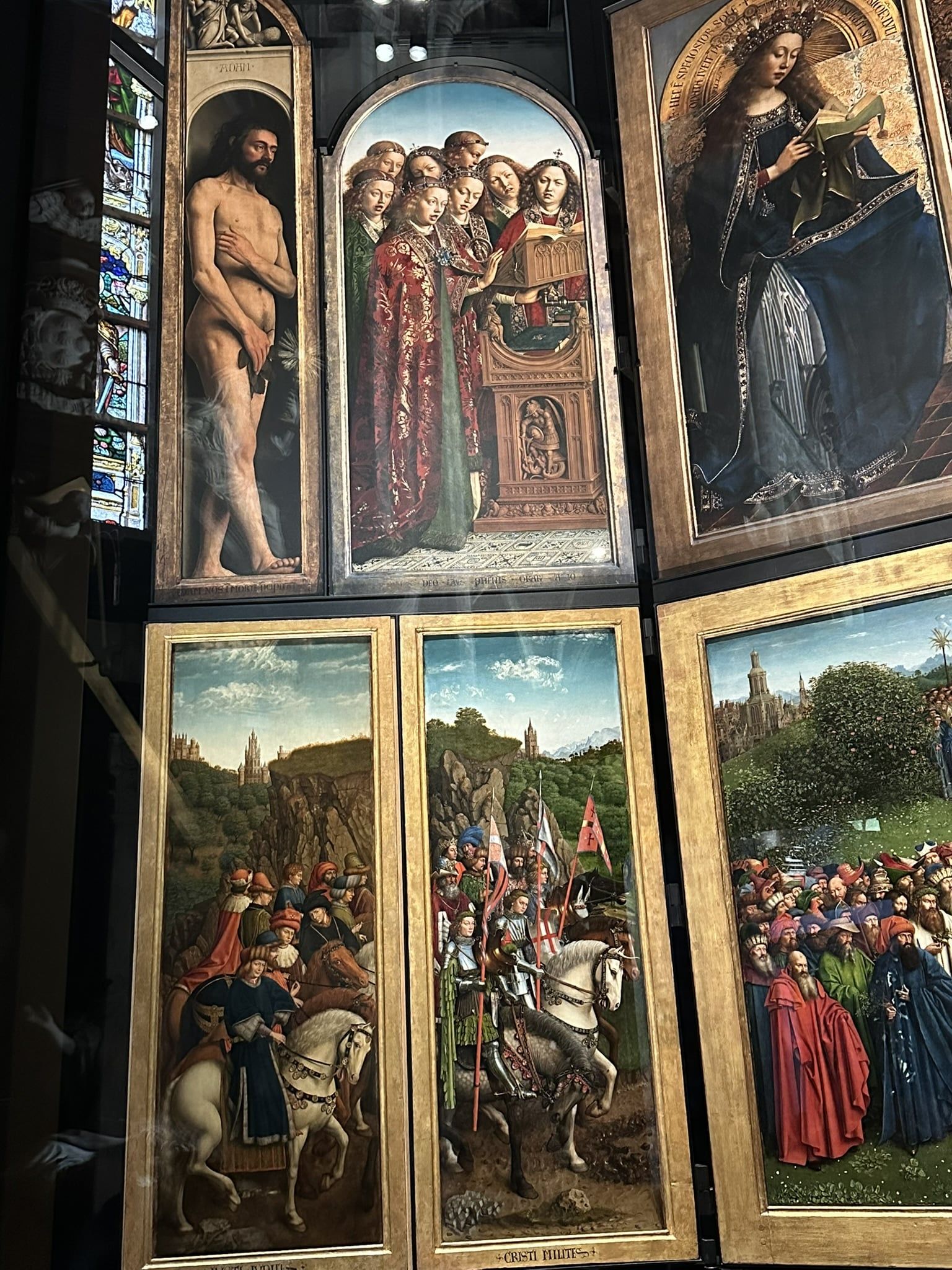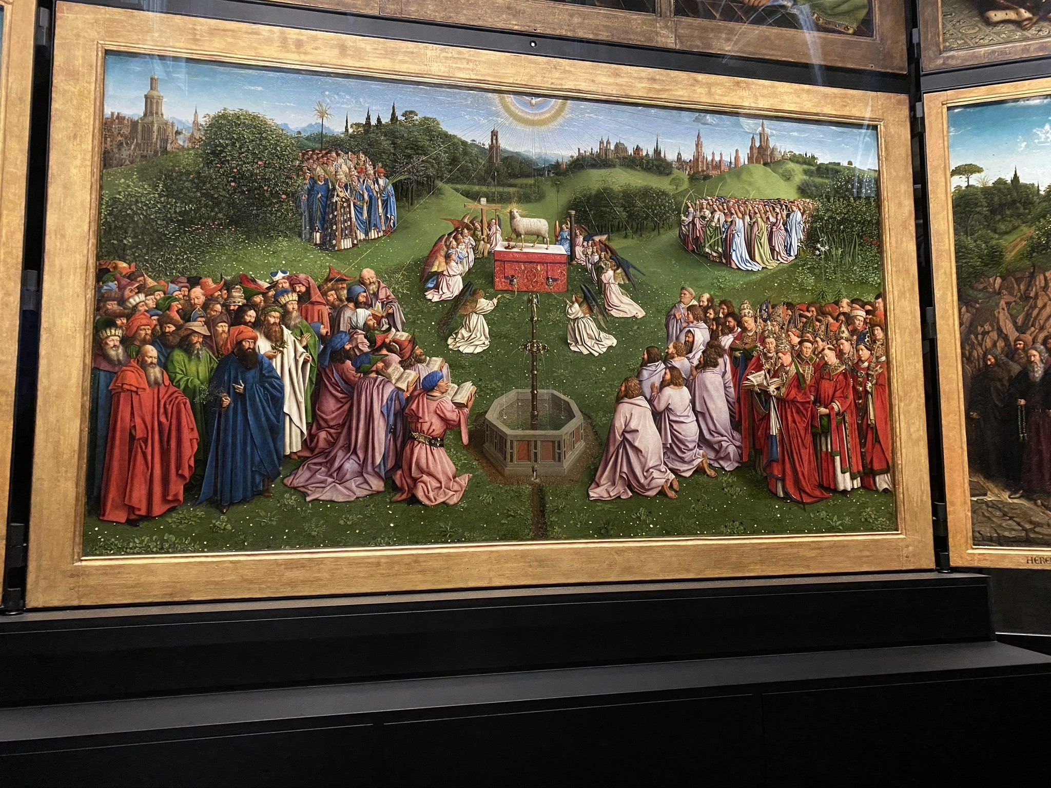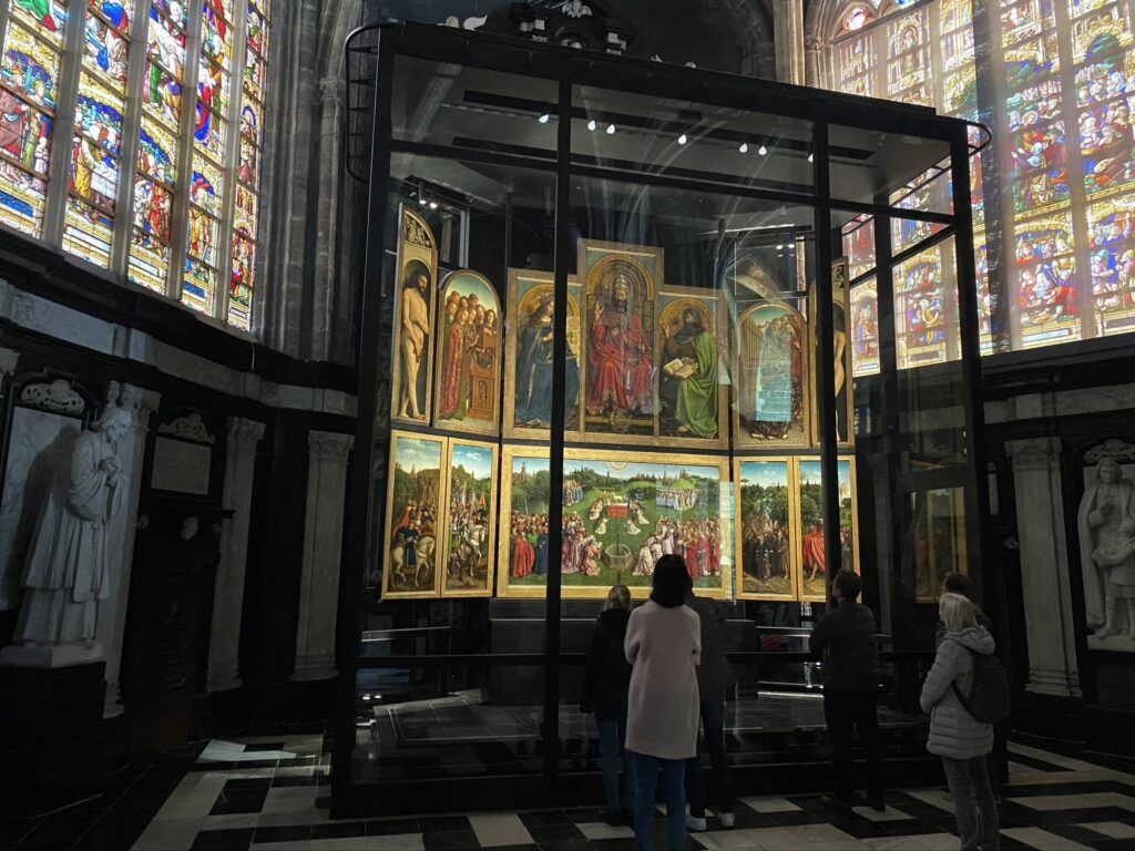El Retablo de la Adoración del Cordero Místico es una de las más grandes obras maestras del arte europeo. Este políptico fue encargado por el matrimonio de Vyd para su capilla a Hubert Van Eyck. Al no acabar la obra por su fallecimiento, se acudió a su hermano menor Jan Van Eyck que lo terminó y fue inaugurado finalmente en 1432. Compuesto por 20 paneles están pintados por ambos lados. El retablo originalmente permanecía la mayor parte del tiempo cerrado, siendo abierto solamente los domingos y festivos.