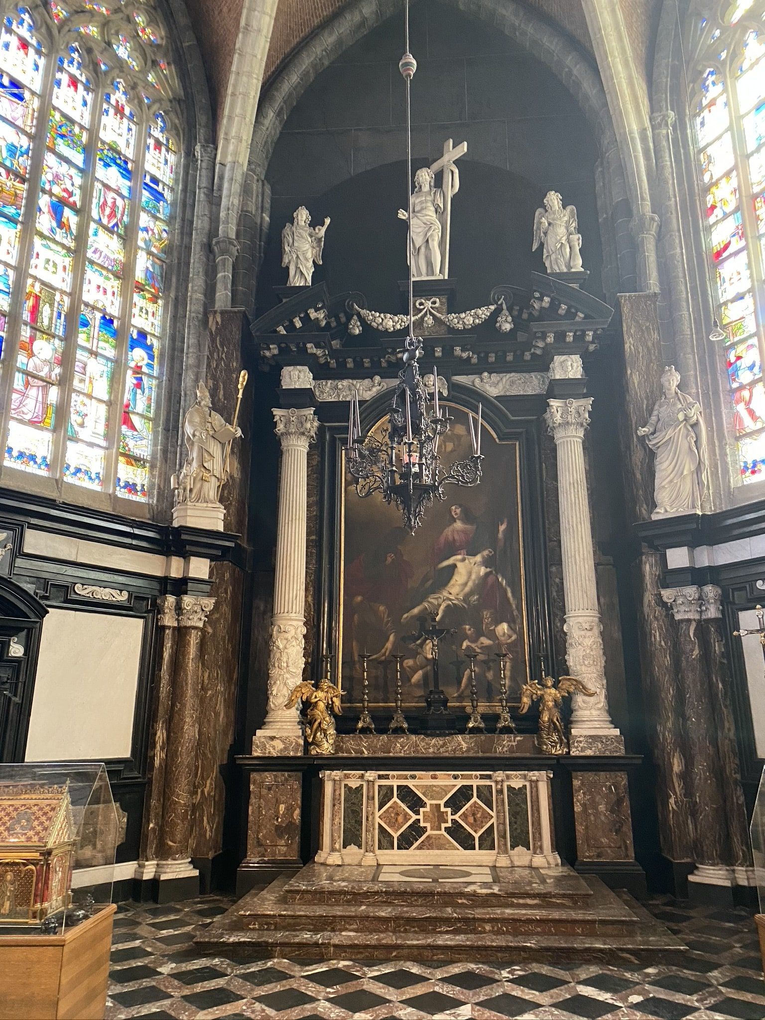 En el camino desde la cripta hasta el retablo, atraviesas sin pasar por alto, la capilla de Rubens (del que ya hemos hablado con algo más detalle en Amberes), que lleva el nombre del autor de la composición que se muestra allí llamada la “conversión de San Bavón”. Es un cuadro que irradia un gran poder, desbordante de vida y colores, tal y como nos tiene acostumbrado Rubens. Para él fue uno de sus mayores logros.