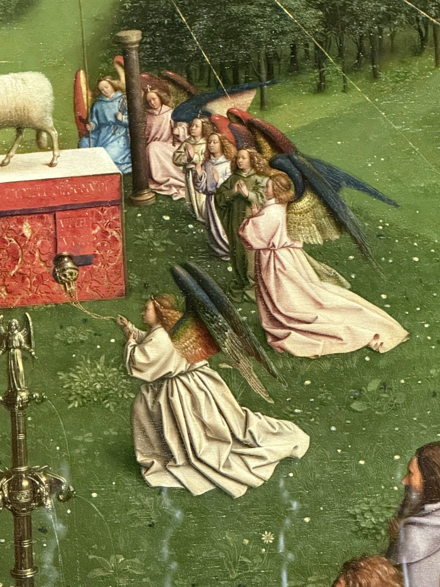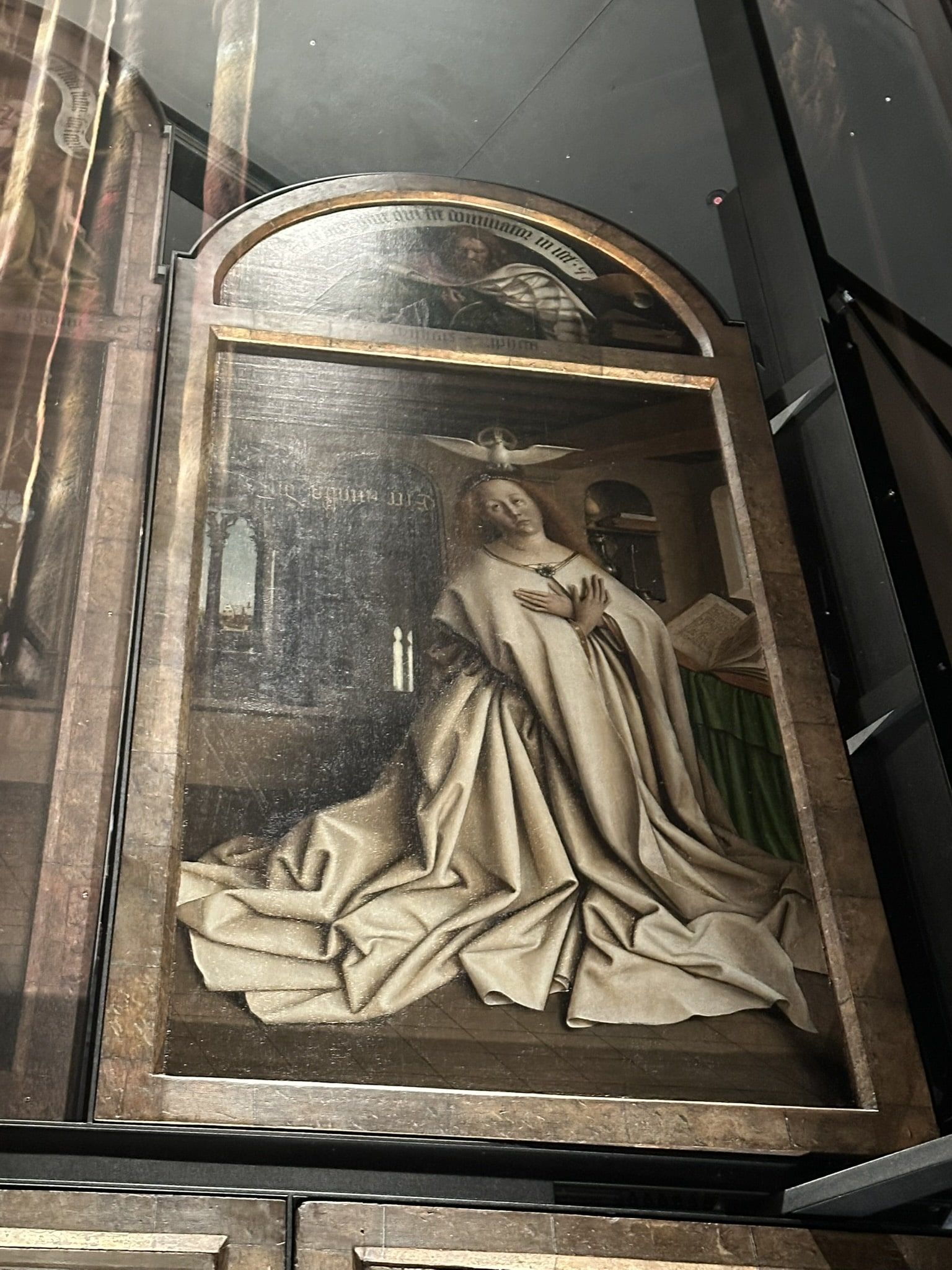 Y por fin, el momento esperado, la entrada a la tranquila capilla de los sacramentos, en el extremo de la catedral, donde se encuentra el retablo abierto y acristalado para evitar daños exteriores. El juego de iluminaciones hace que puedas verlo con gran claridad (a diferencia del cuadro de Rubens) y acercarte a observar los detalles a pesar del cristal. Es cierto, que los paneles más altos son más difíciles de observar, a no ser que uses el siempre útil teleobjetivo del teléfono. A diferencia de otros cuadros coetáneos e igual de famosos como el Jardín de las Delicias (por citar un ejemplo), la limitación de la visita hace que puedas estar tranquilo viendo cada uno de los detalles del cuadro, sin pelearte con el personal.