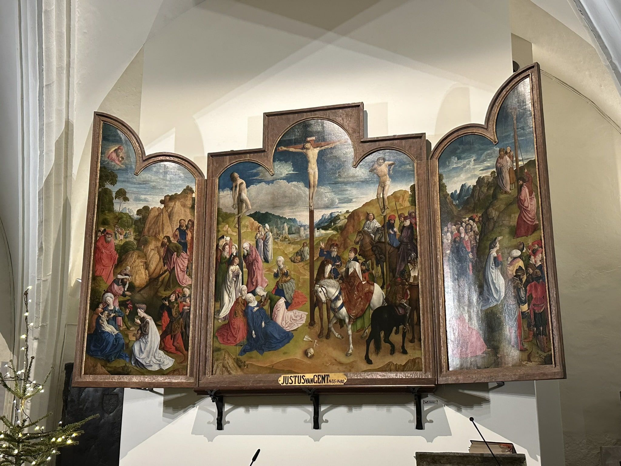 Allí es donde se realiza el tour de realidad aumentada y allí todavía se perciben aún elementos románicos —sobre todo en la nave central— y lo más valioso es que no está “vacía”: sus muros conservan pinturas murales de época bajomedieval (siglos XIV–XVI), descubiertas en buena parte en el siglo XX durante obras. Después del recorrido, y antes de proceder a visitar el retablo, es recomendable dar un pequeño paseo por la misma y valorar este arte. En la cripta puedes observar 1) el impresionante tríptico de Justus van Gent, el Calvario (la segunda obra más importante del primitivo flamenco de la catedral), 2) la cabeza decapitada en plata de San Juan Bautista de Johannes De Doper y/o 3) la tumba del mismísimo Hubert Van Eyck.
