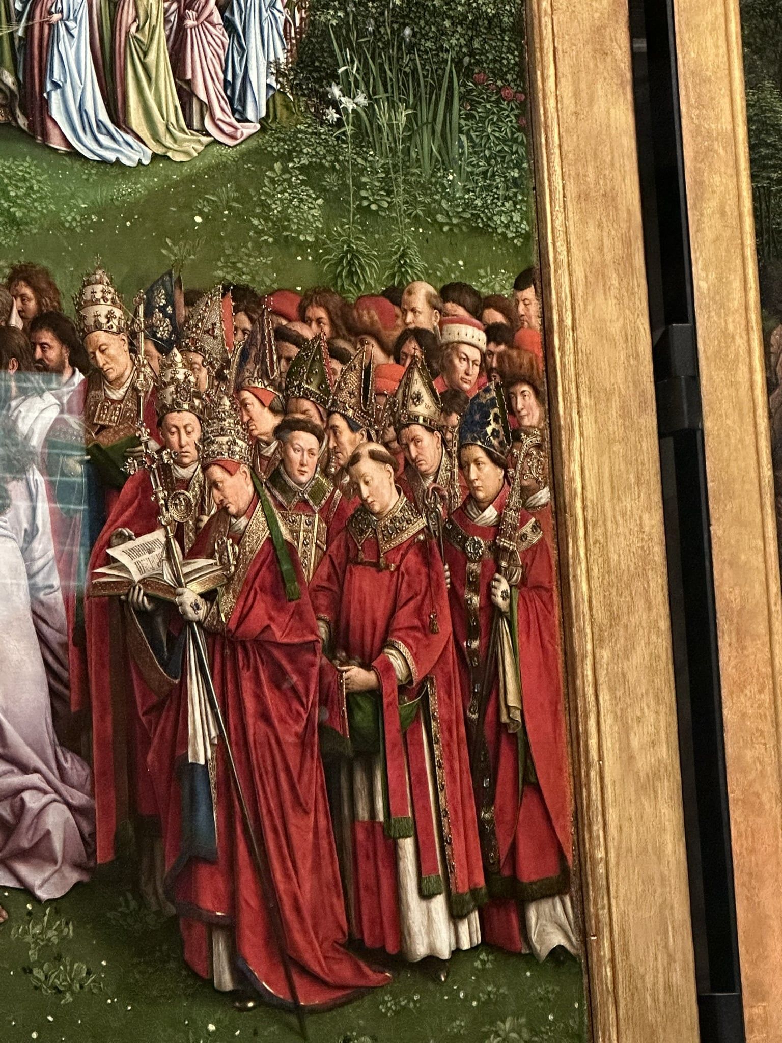 Acto seguido, te dirigen a un espacio donde empiezan a darte información sobre el conjunto de cuadros, y explicándote algunos de los detalles de este, que lo hacen tan especial, como la representación realista de flores, árboles y otras plantas (se han podido determinar 42 tipos), como el detalle y la precisión representando a los santos, obispos y Papas, los discípulos, evangelistas y mujeres mártires, entre otros, San Livino, antiguo santo patrón de Gante, que sujeta su lengua con unas pinzas recordando su martirio: se la cortaron por predicar el cristianismo.